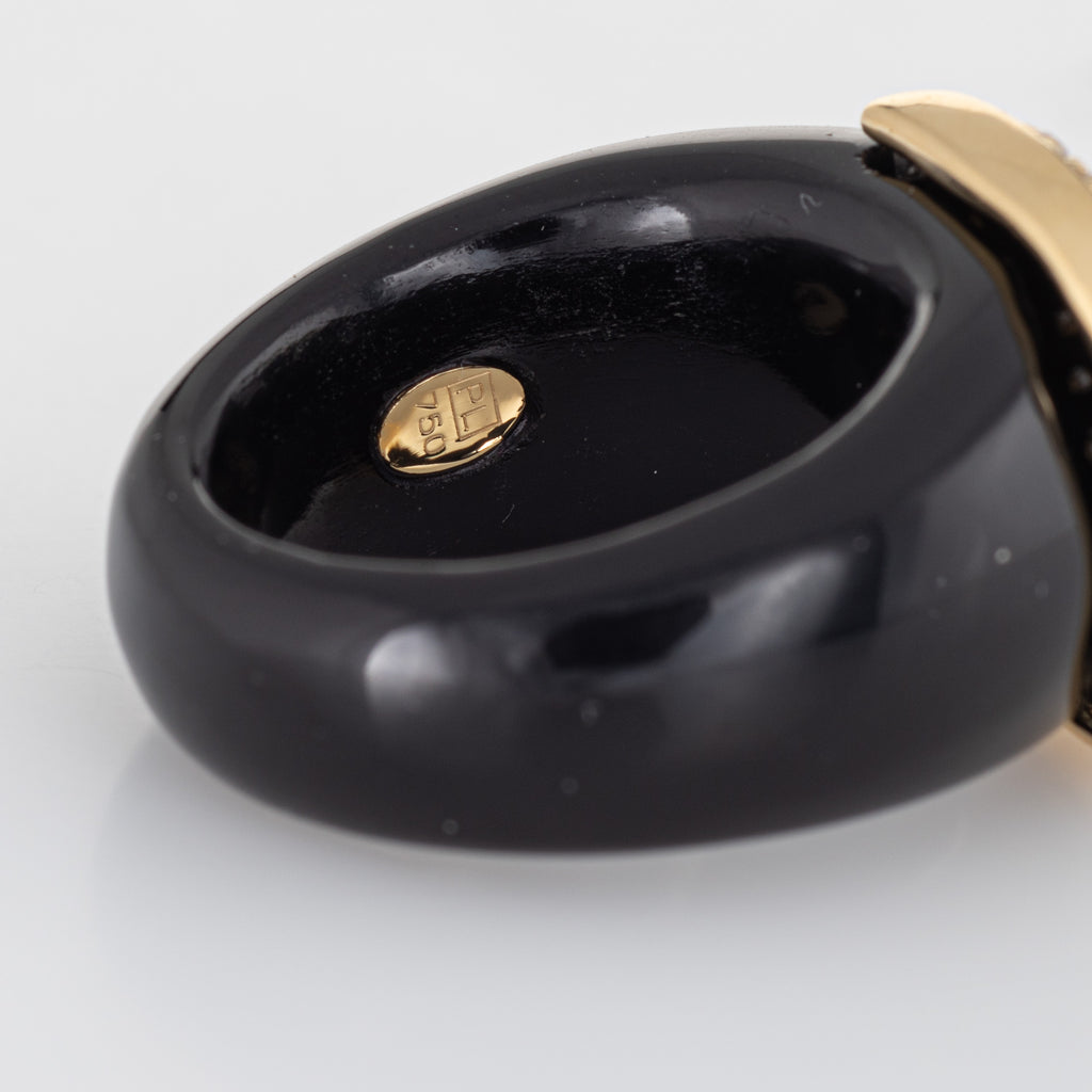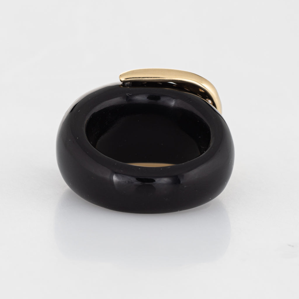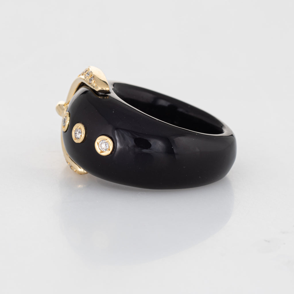 Stylish black resin diamond buckle ring crafted in 18 karat yellow gold.
