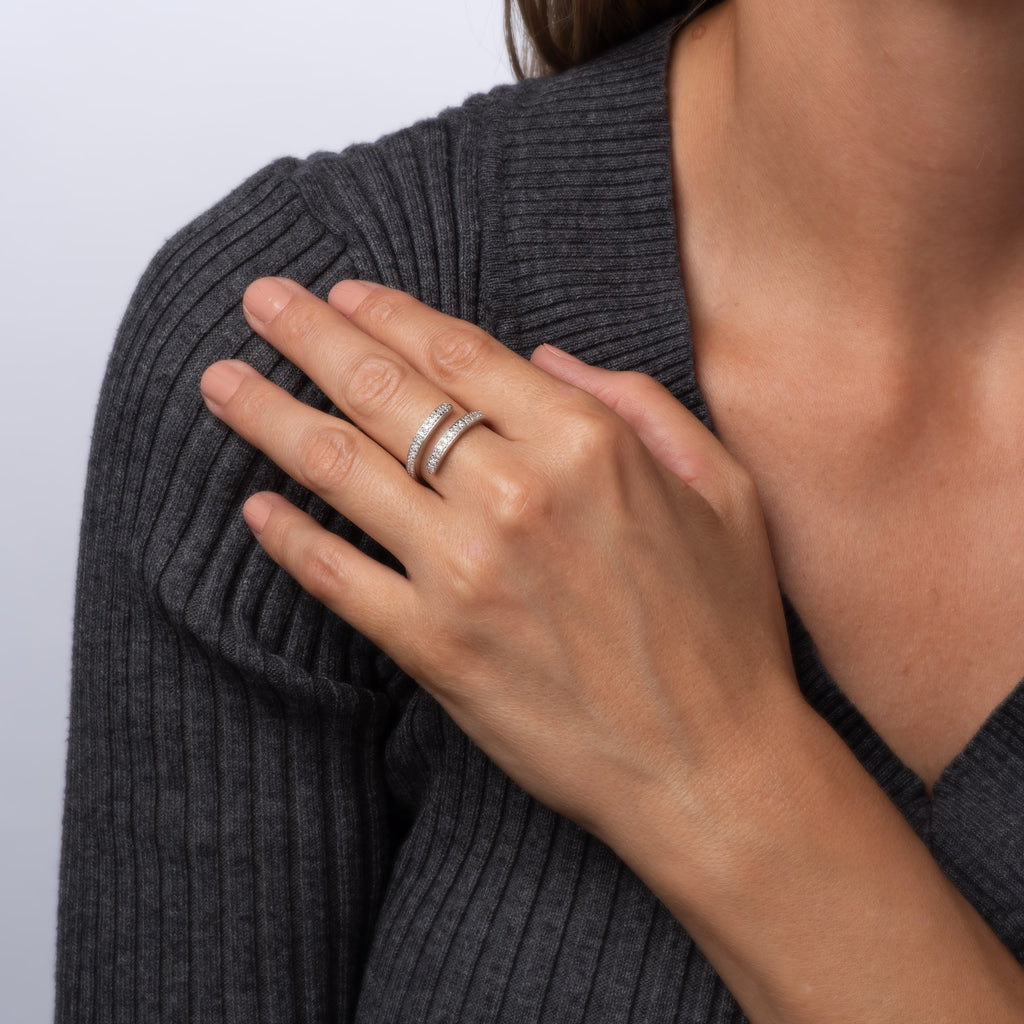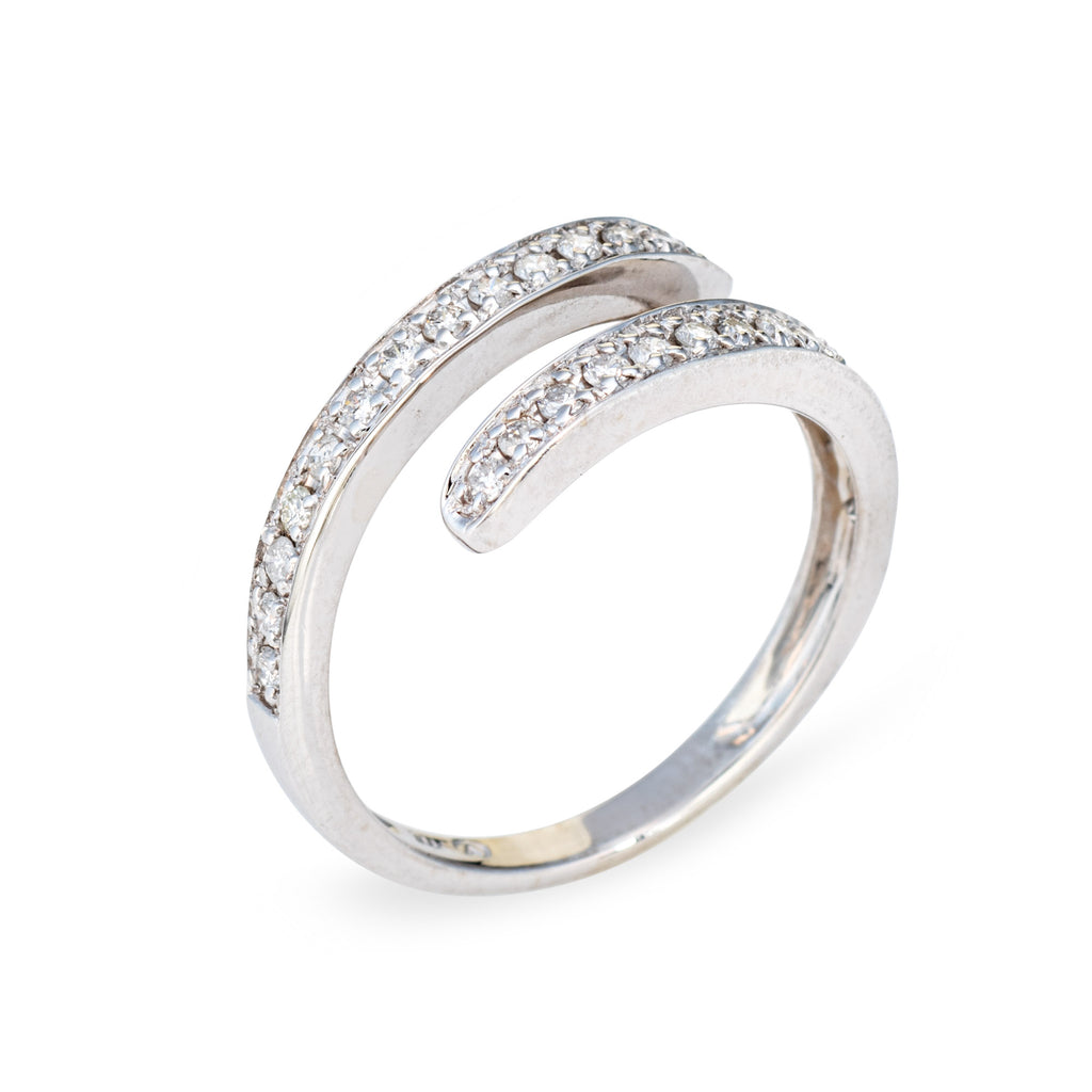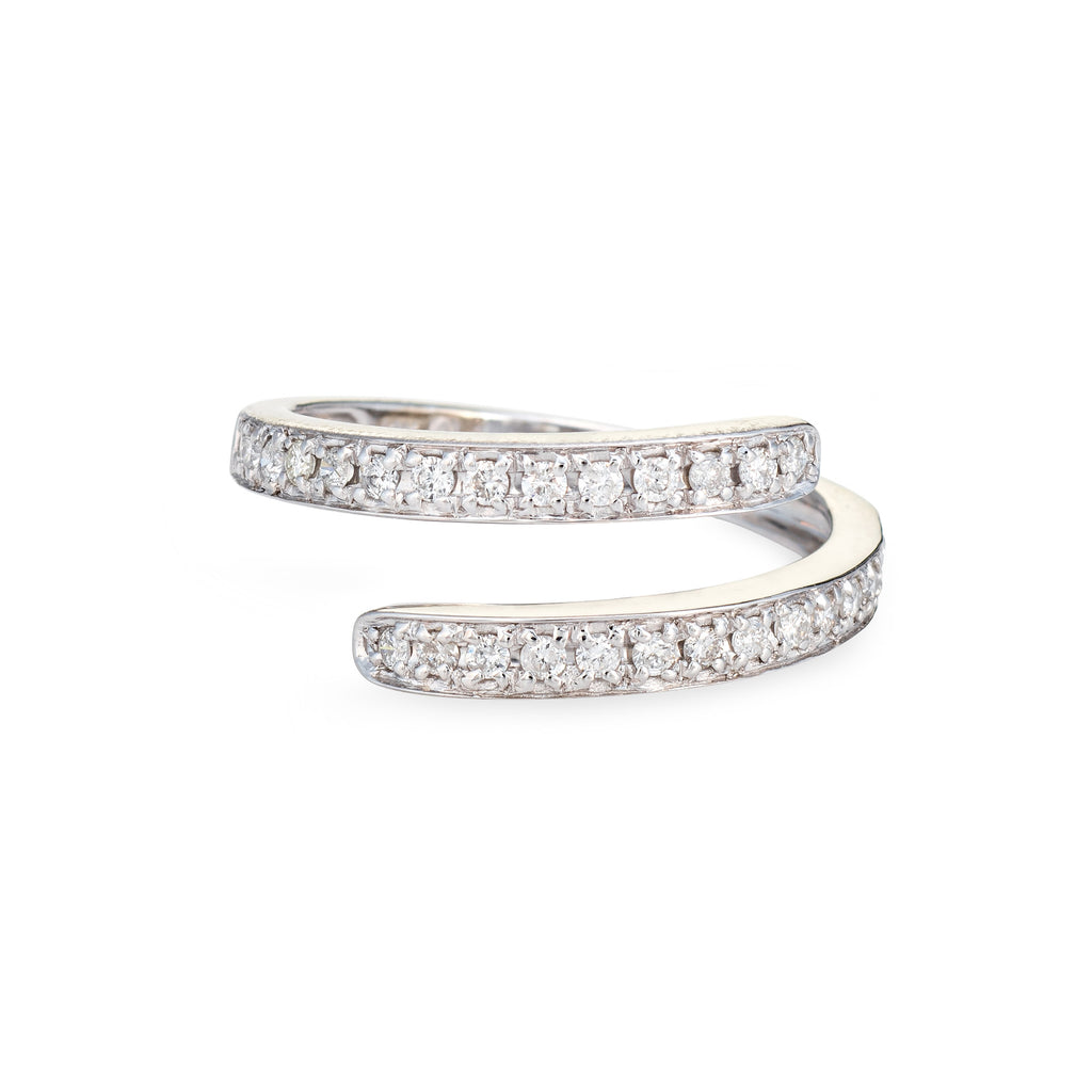 Set with bright white sparkling diamonds the bypass ring is great worn alone, worn with an engagement ring or stacked with your fine jewelry from any era. The low rise band (2.5mm - 0.09 inches) sits comfortably on the finger.