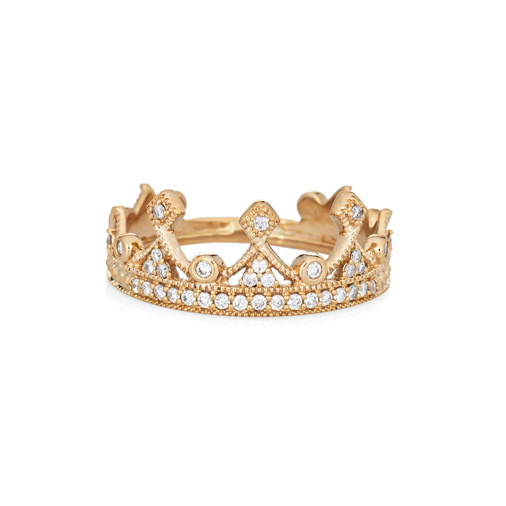 The stylish ring depicts an elaborate crown with three central tiers. The ring makes a nice statement on the hand and can be worn alone or layered with your fine jewelry from any era. The low-rise ring (1.5mm - 0.05 inches) sits comfortably on the finger.