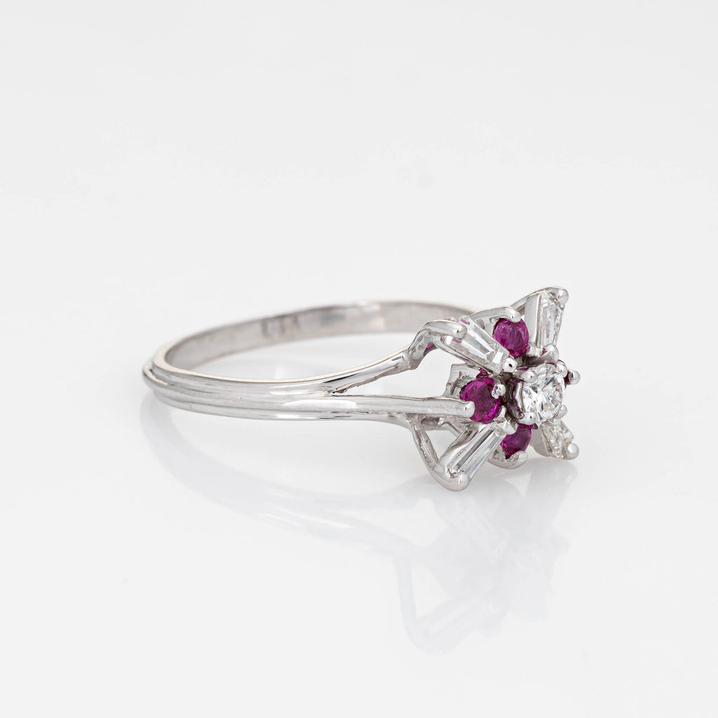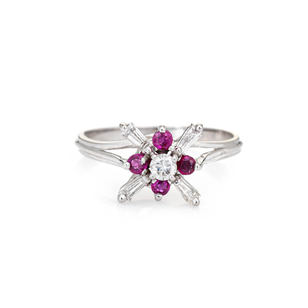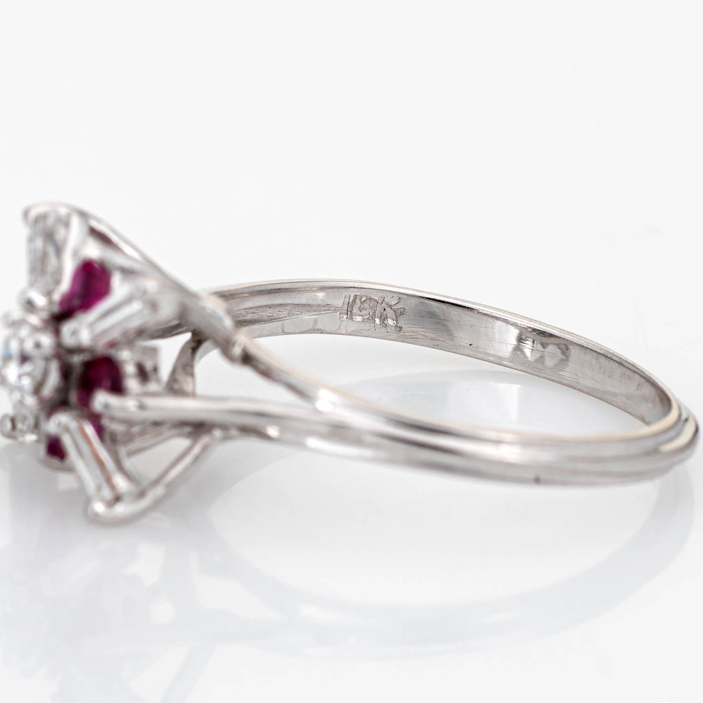 Stylish vintage diamond & ruby cocktail ring crafted in 18 karat white gold.