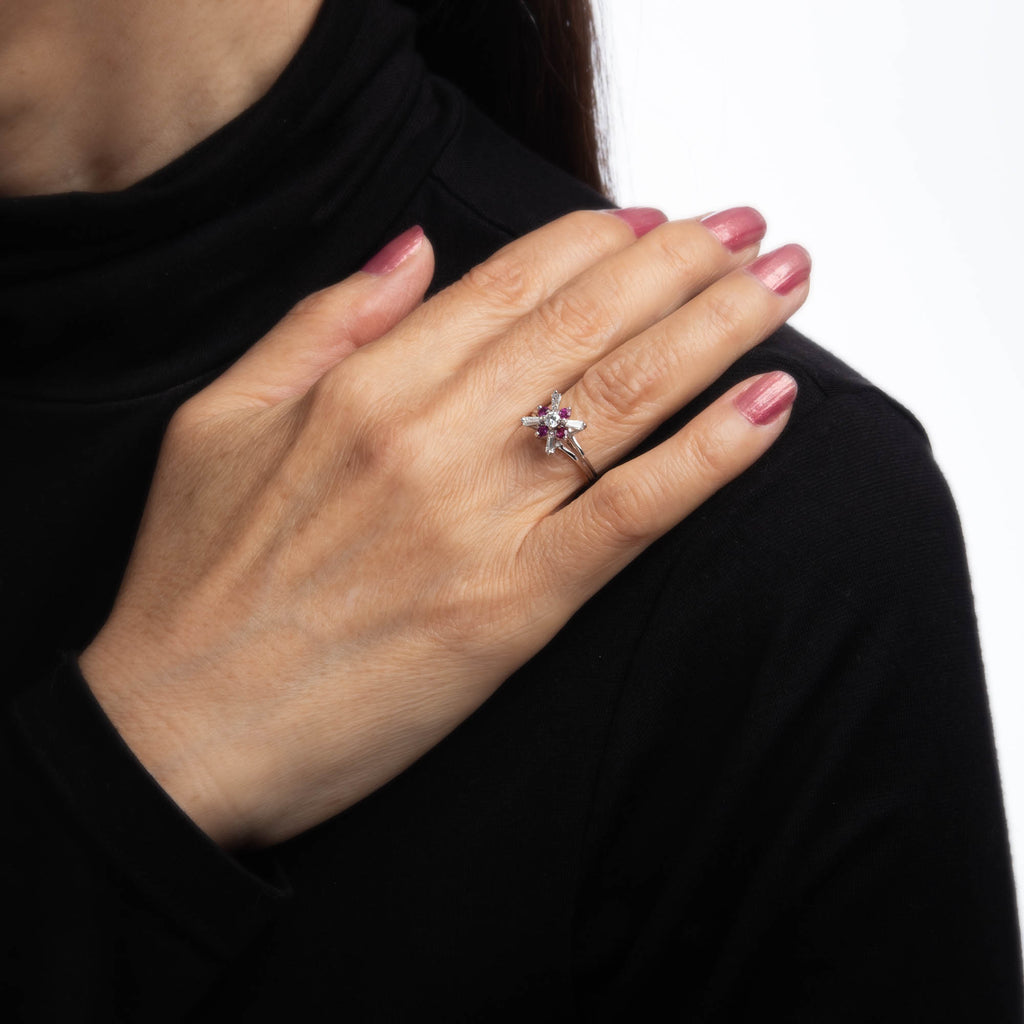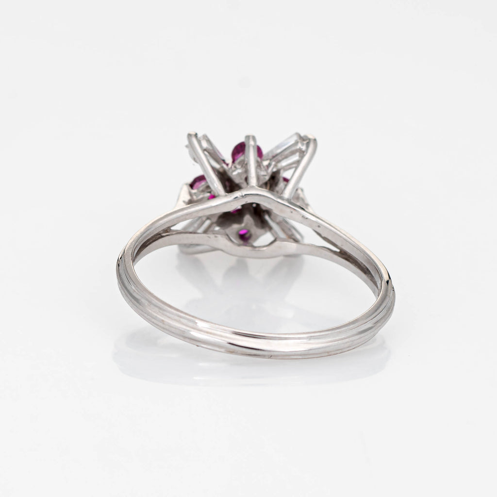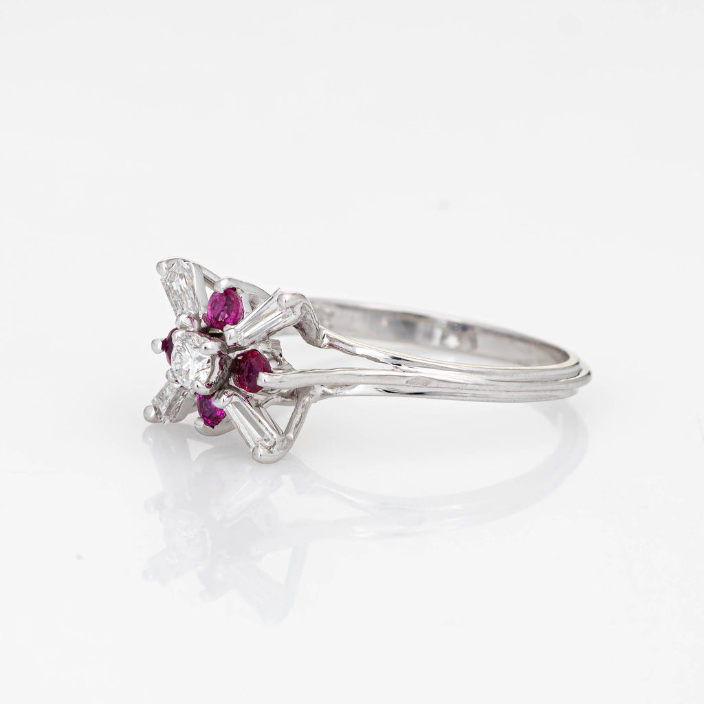 Tapered baguette cut diamonds are set in a star like setting with the rubies adding a pop of color. The cocktail ring makes a nice statement on the hand. The medium rise ring (8mm - 0.31 inches) sits comfortably on the finger.