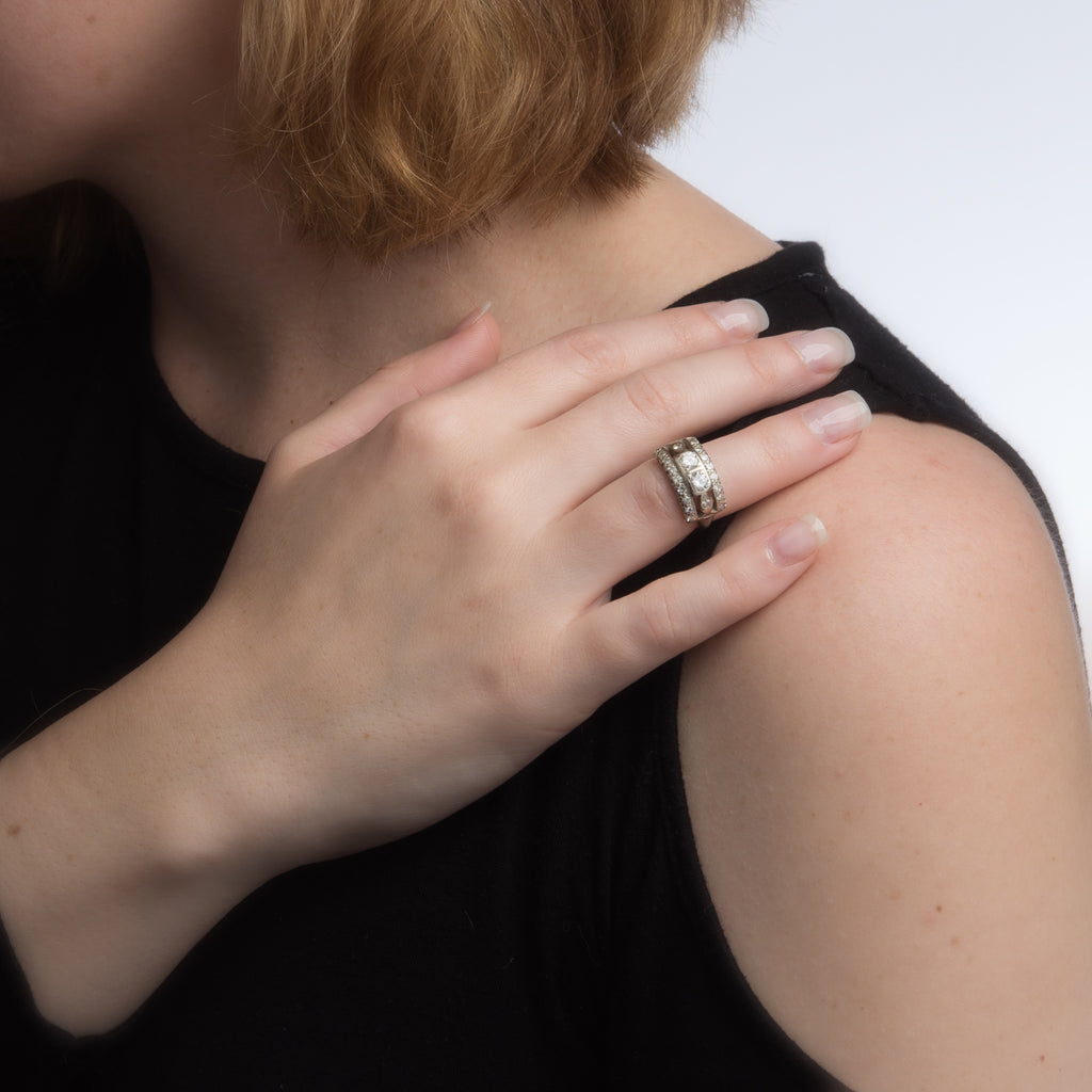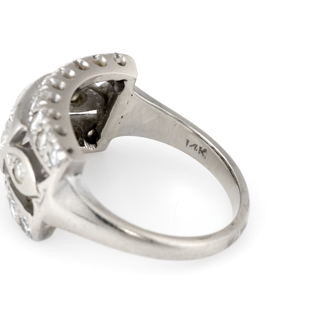 Metal & Hallmark: 14 karat white gold. The ring is hallmarked "14k".