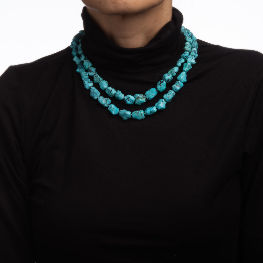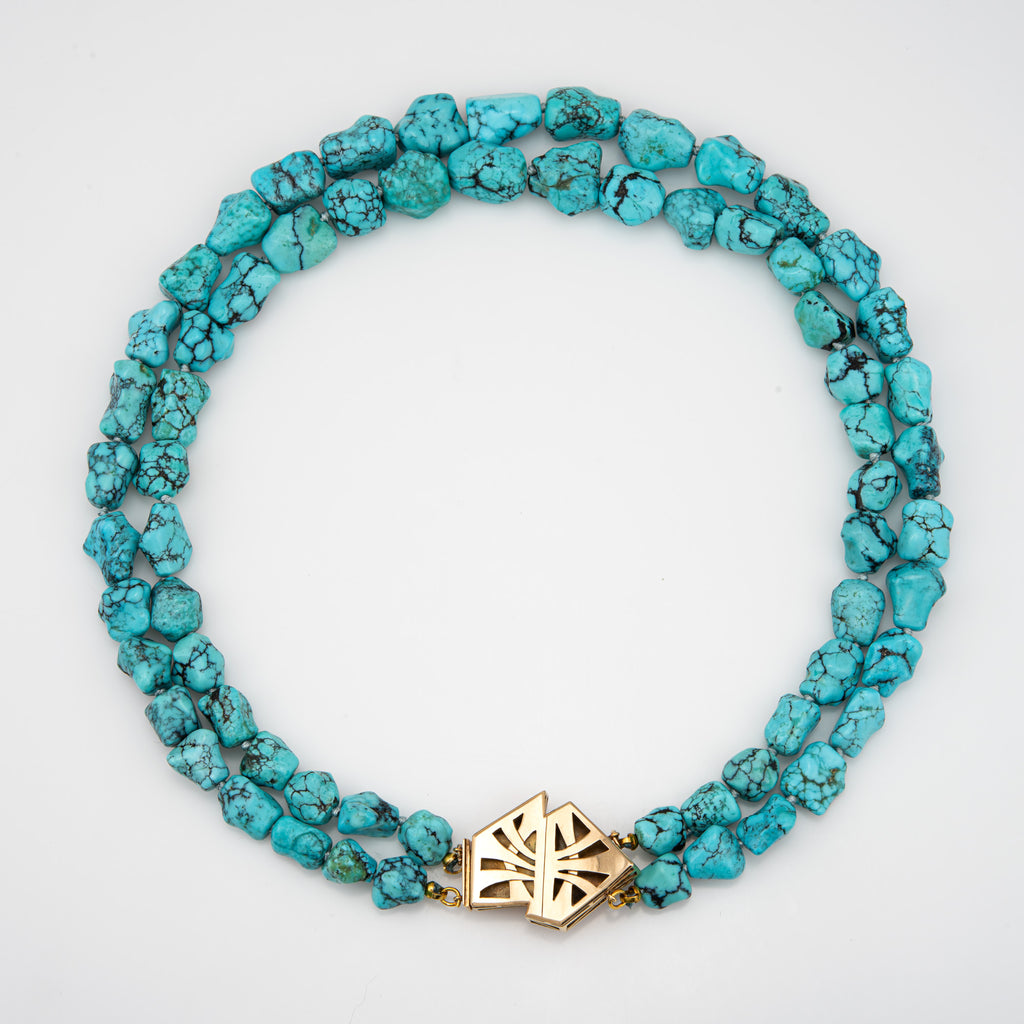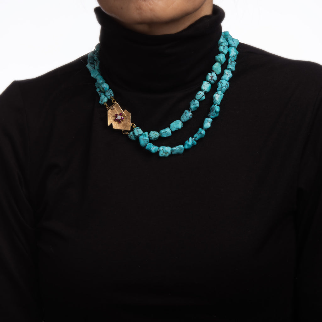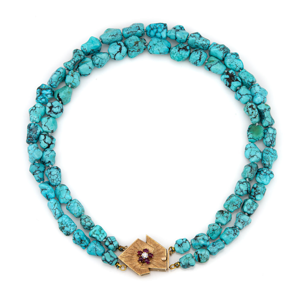 Stylish vintage turquoise double strand necklace, finished with a 14k yellow gold gem set clasp (circa 1960s).