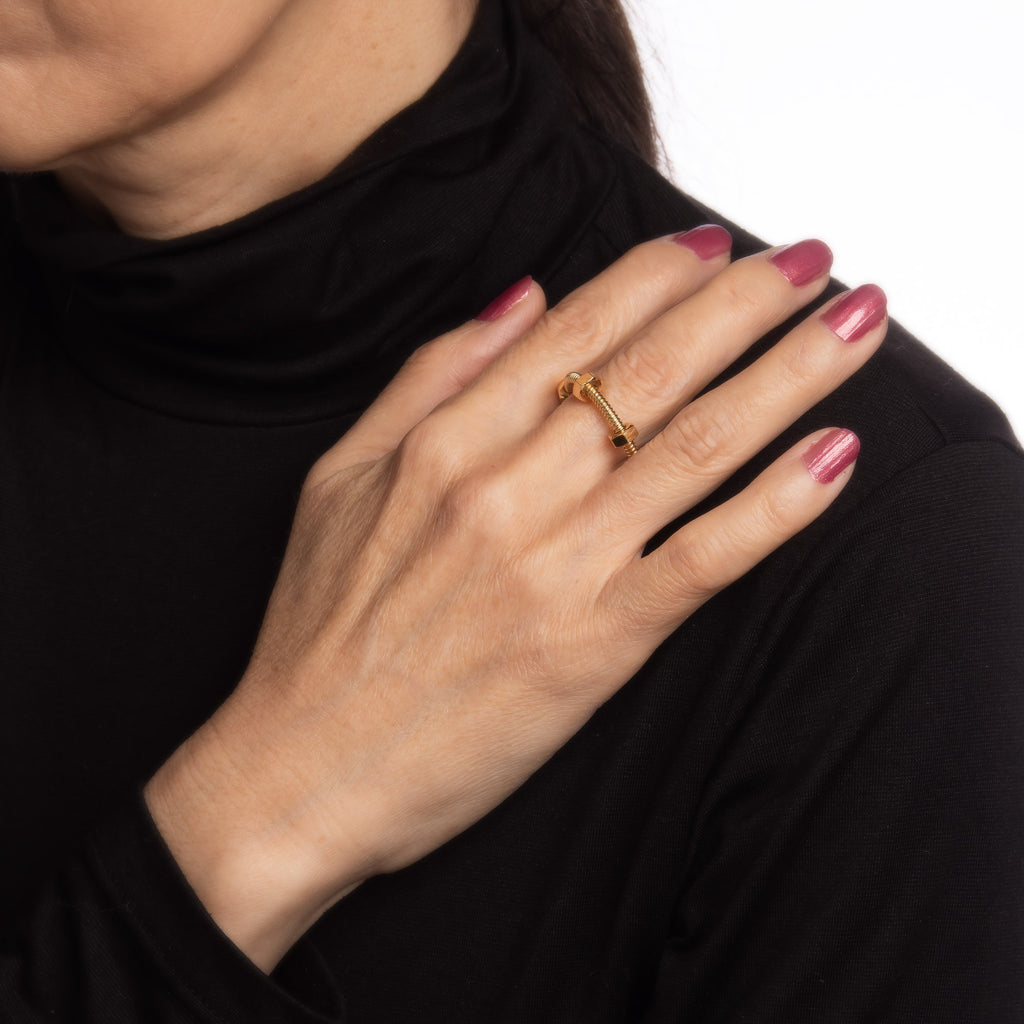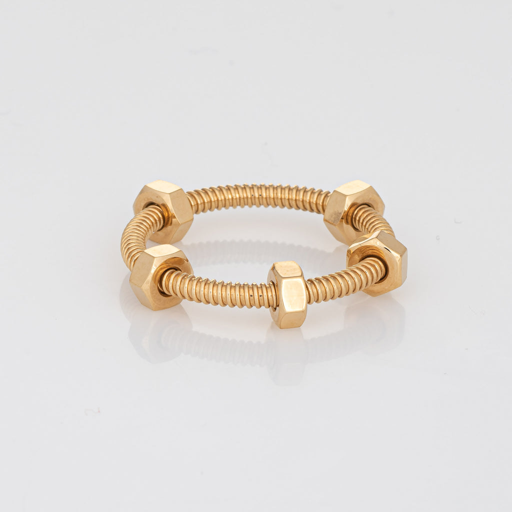 'Ecrou' means 'nut' in French, as in the hardware. The ring has an industrial feel with a luxurious spin. The 'nuts' are designed to move smoothly along the ring in 360 fluid motion. The ultimate ring to fiddle with and configure the nuts in any form that you would like.