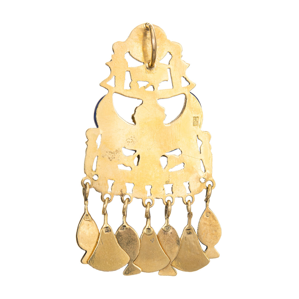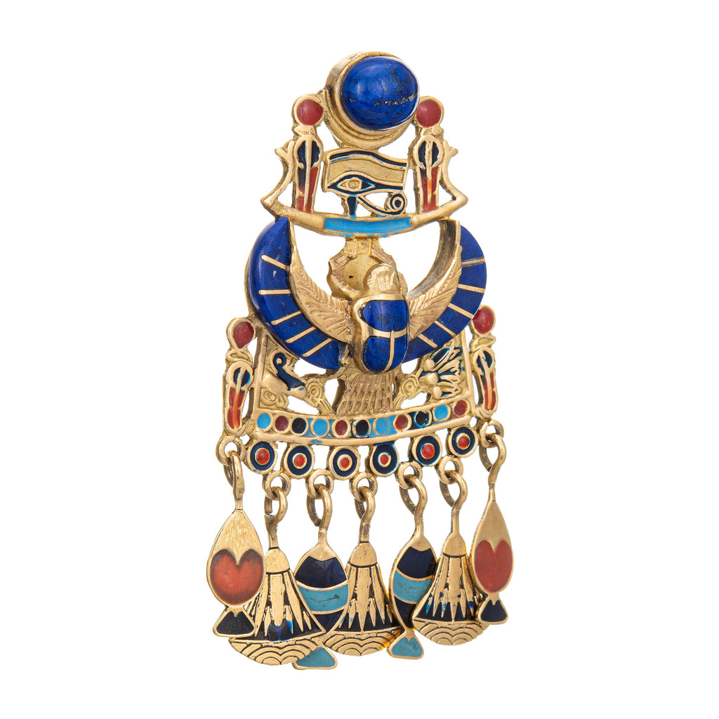 The elaborate pendant is beautifully detailed with various Egyptian symbols. The Eye of Horus is enameled in shades of blue, a symbol of protection against envy, disease and evil spirits. A winged scarab, one of the most popular amulets, is a symbol of death, rebirth, and protection in the afterlife. The base of the pendant features a fringe of movable enameled charms. The pendant is large in scale and makes a great statement when worn.