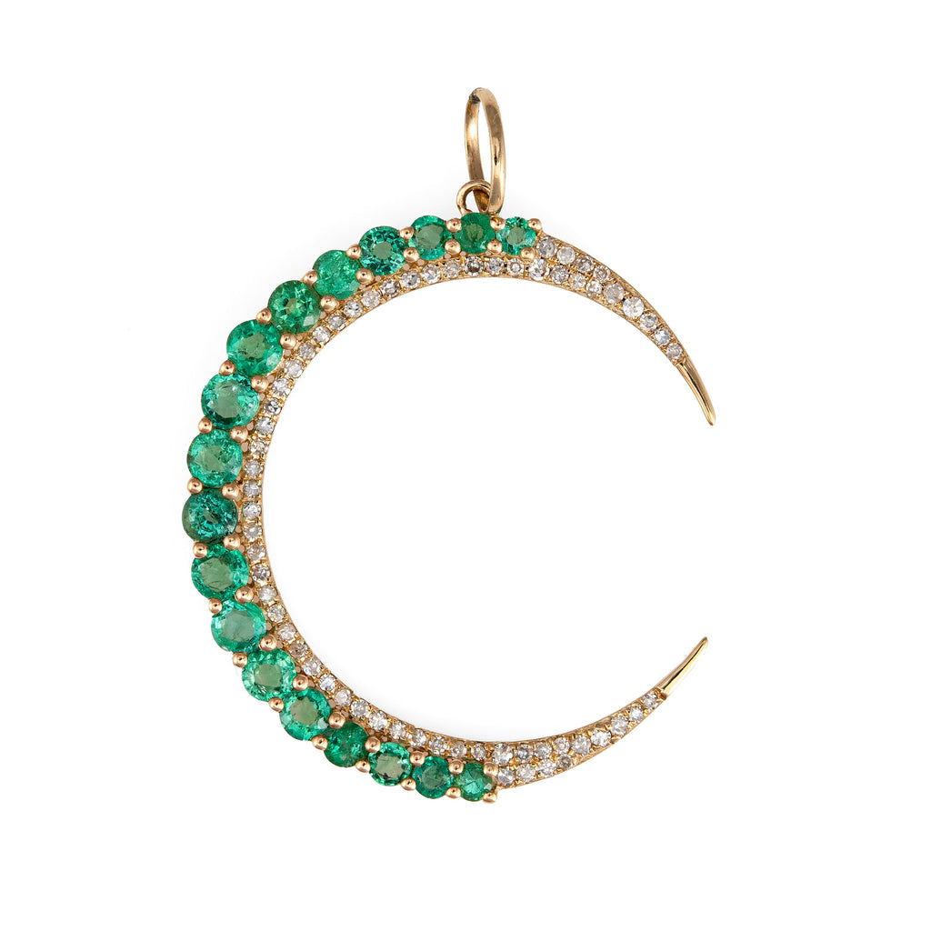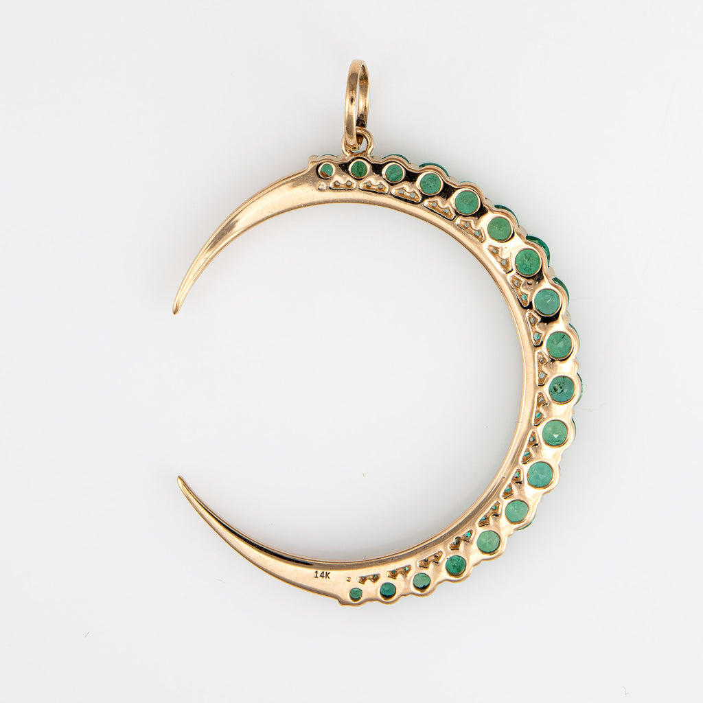 The stylish crescent moon pendant is set with vibrant green emeralds, framed with diamonds. Larger in scale, the 1 1/4 inch pendant makes a great statement. The pendant is ideal worn alone as a standout piece or layered with your fine jewelry from any era.
