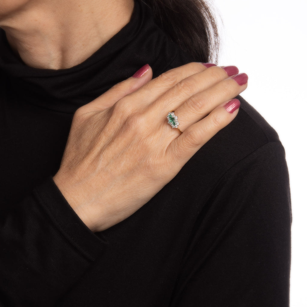 The vibrant emeralds are set in a small cocktail mount, accented with shimmering diamonds. The statement ring adds a nice pop of color on the hand. The low-rise ring (4mm - 0.15 inches) sits comfortably on the finger.