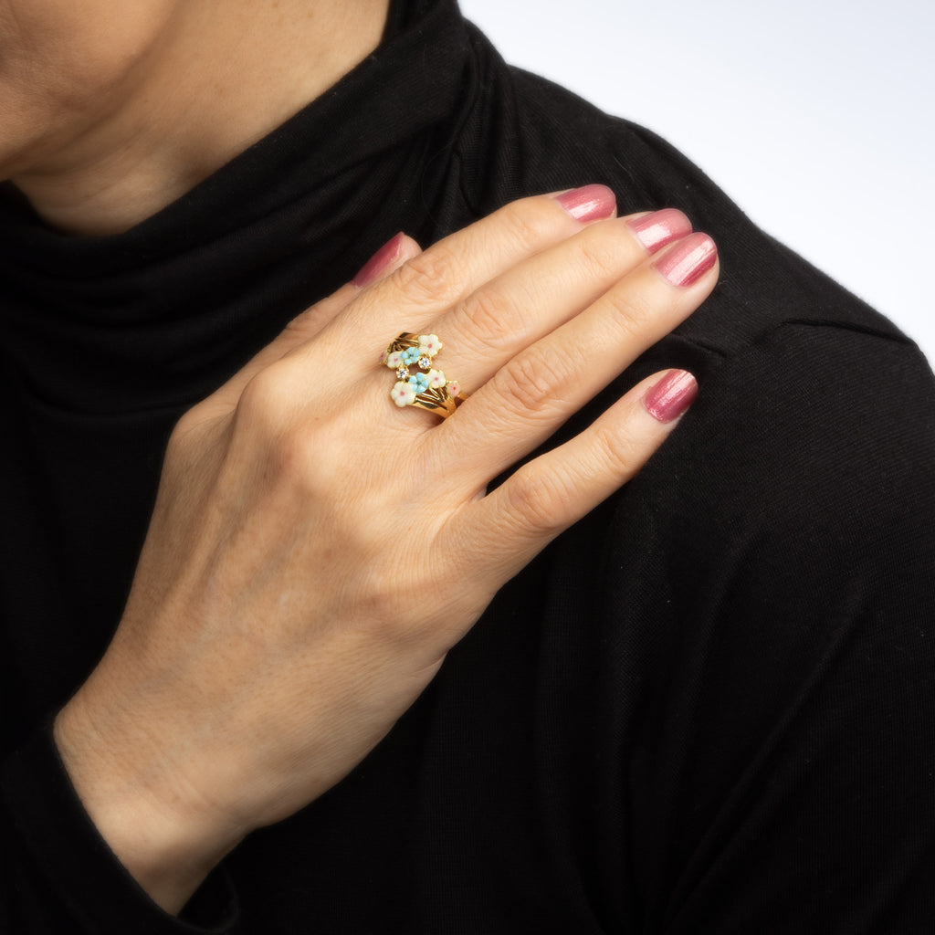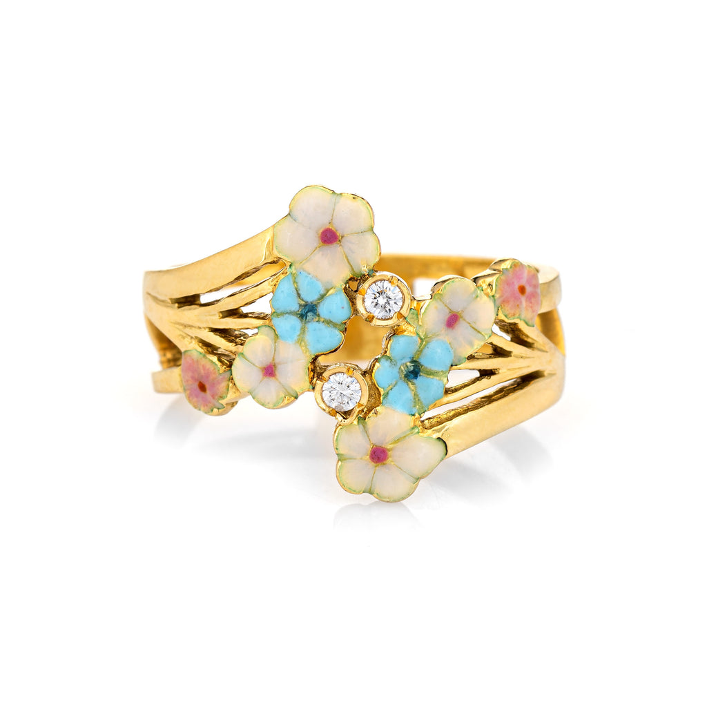 The colorful display of flowers feature enameled petals in soft pastel shades of blue, crème and bits of blush pink. The band sits flat on the finger, and is great worn alone or stacked with your fine jewelry from any era.