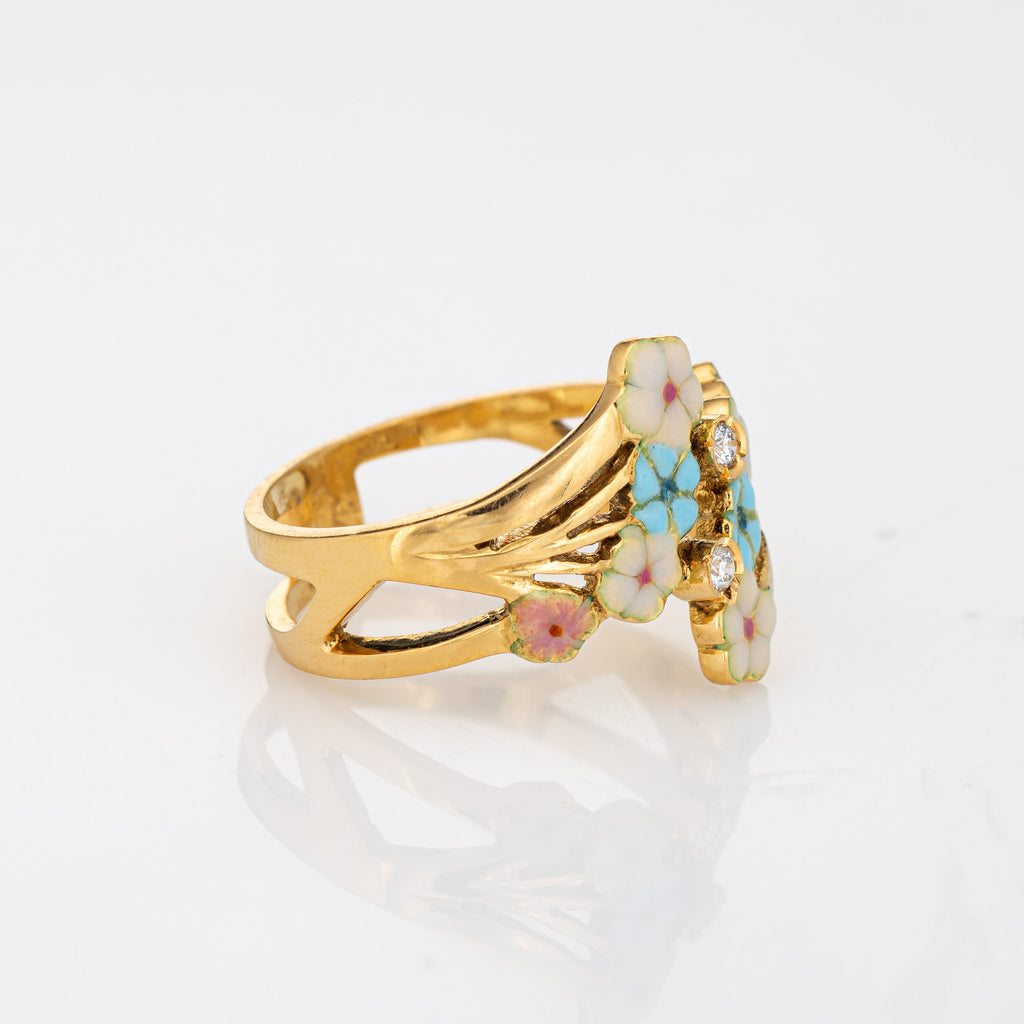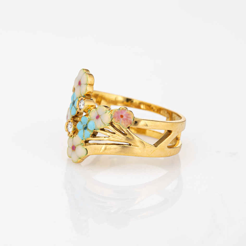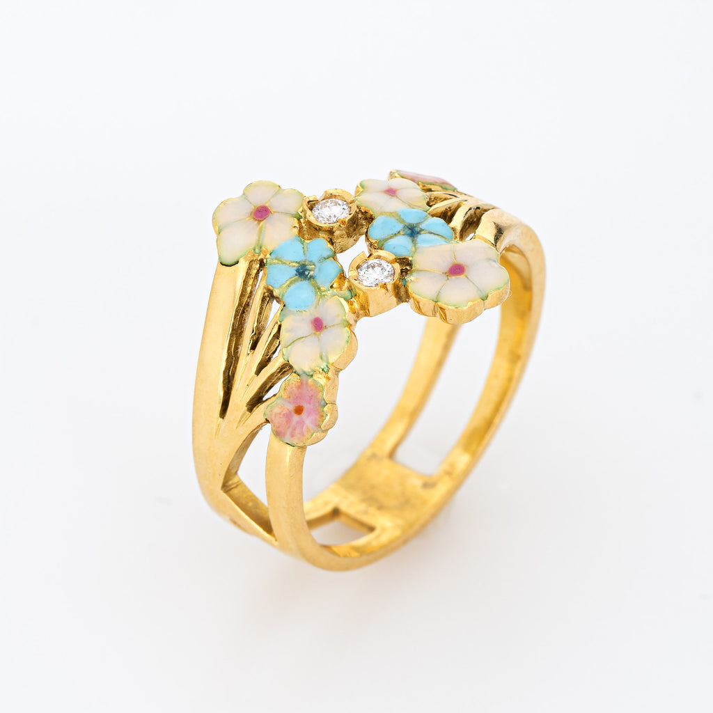 French Enamel Flower Ring Diamond Vintage 18k Yellow Gold Band Sz 7 Jewelry