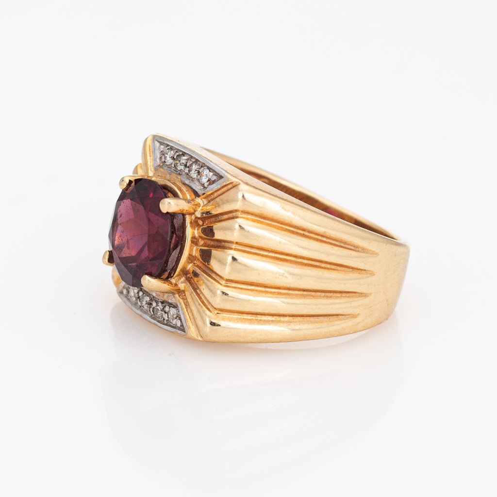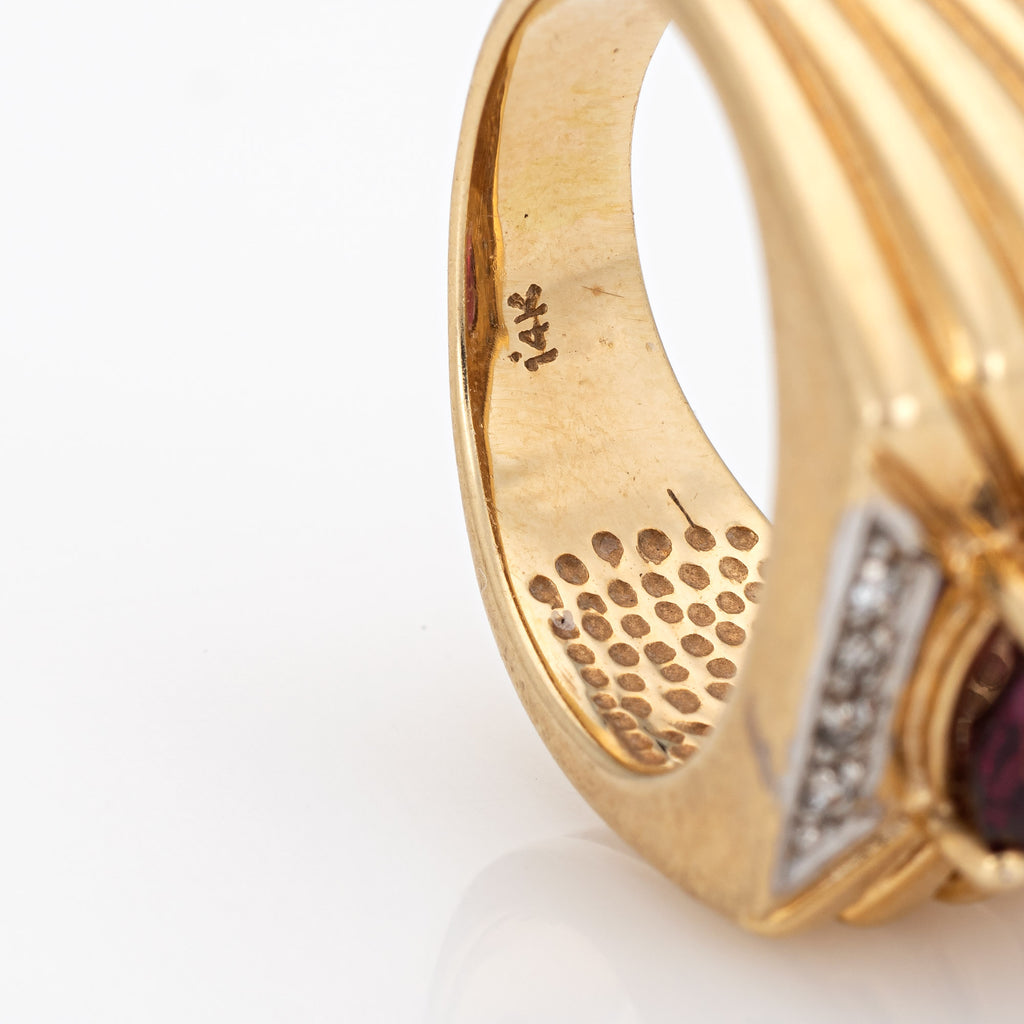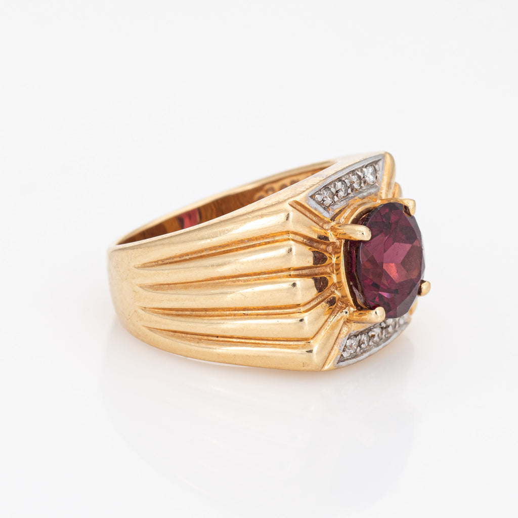 Stylish vintage garnet & diamond ring (circa 1970s to 1980s) crafted in 14 karat yellow gold.