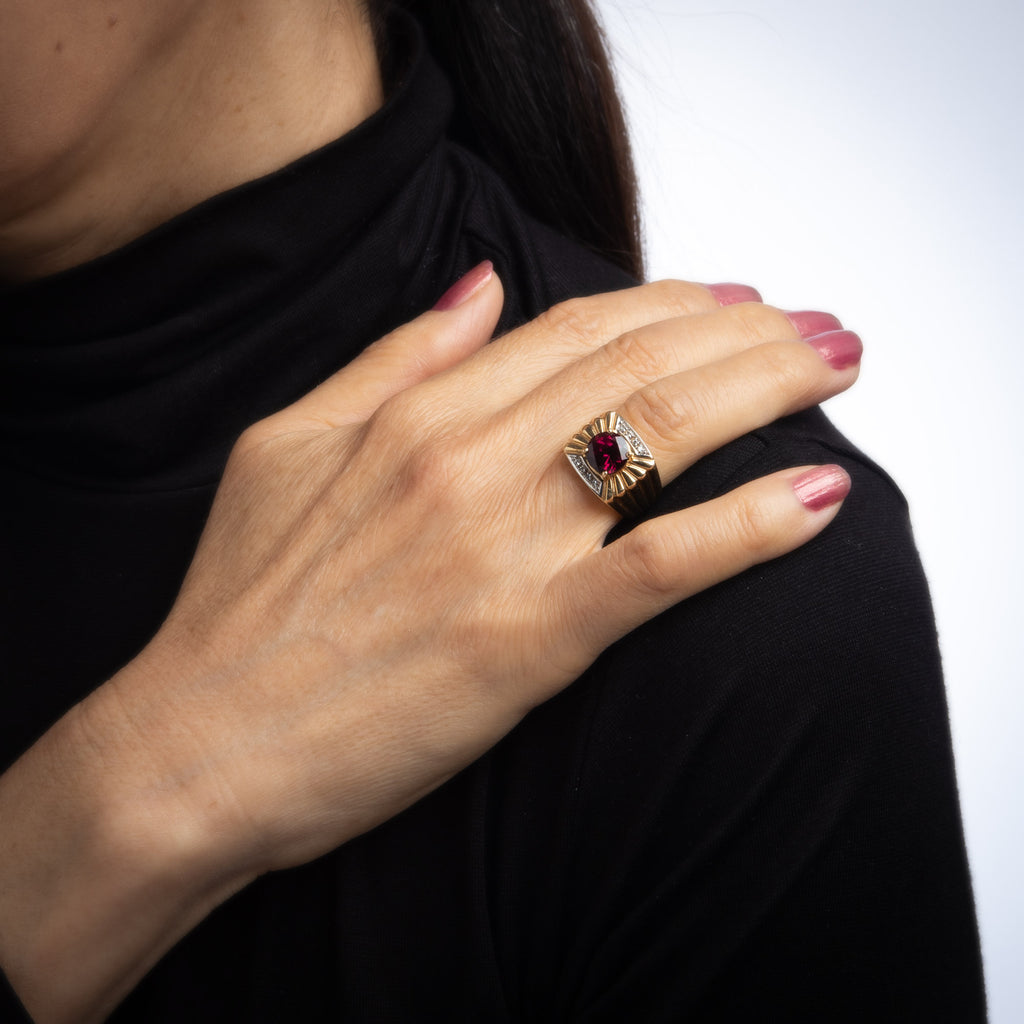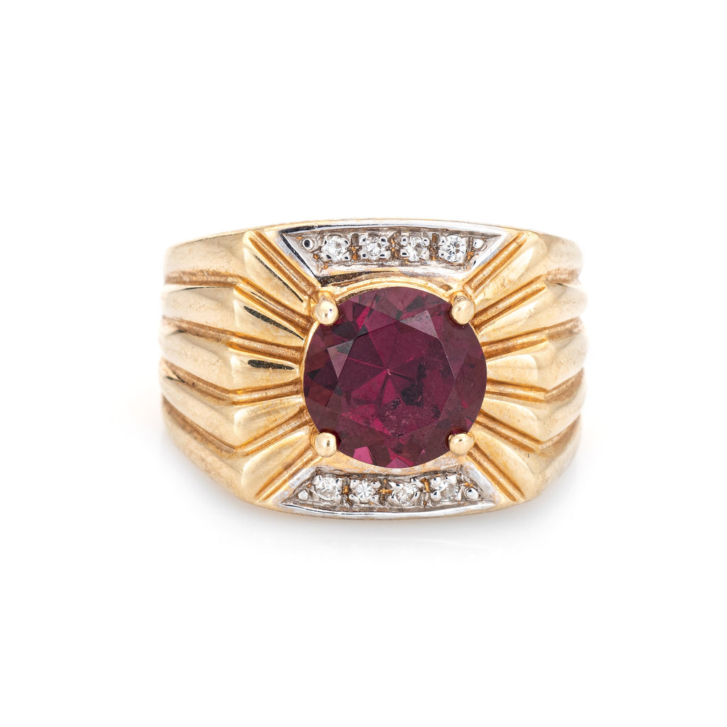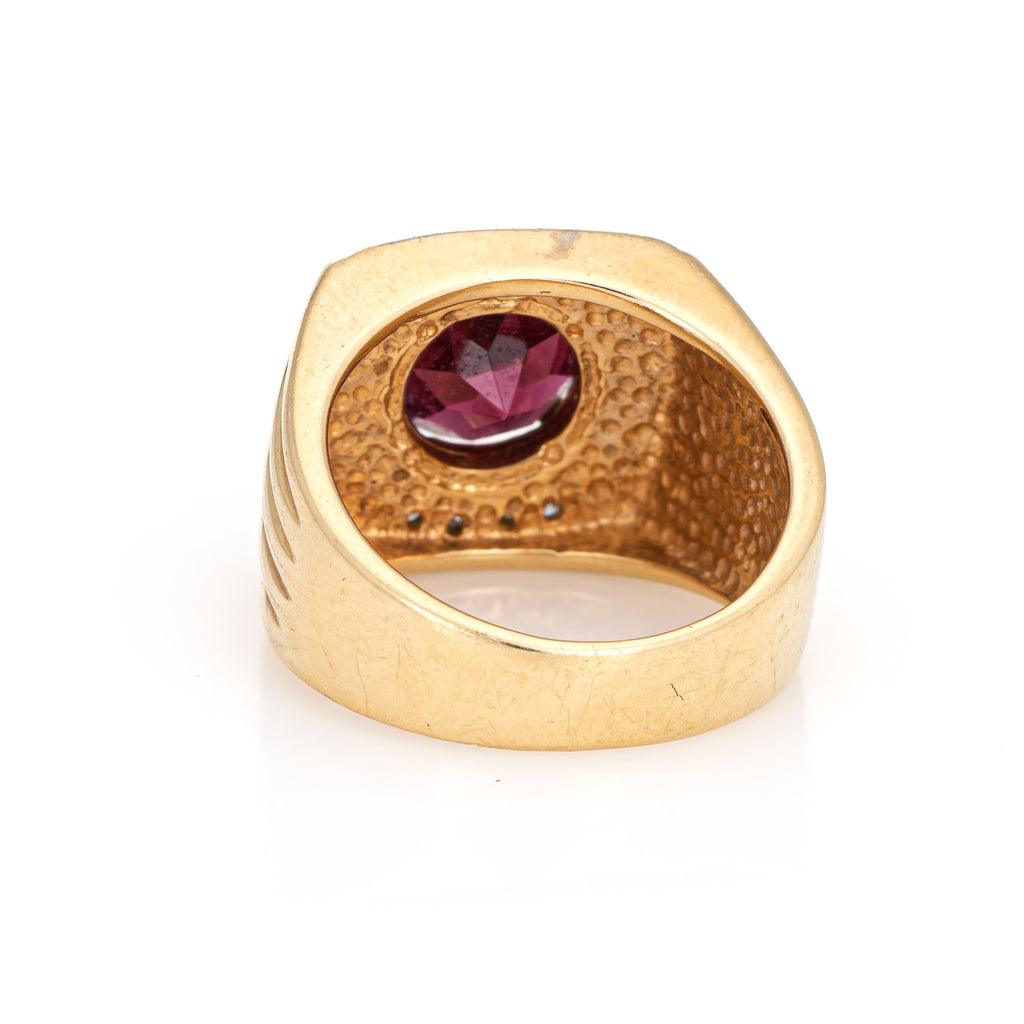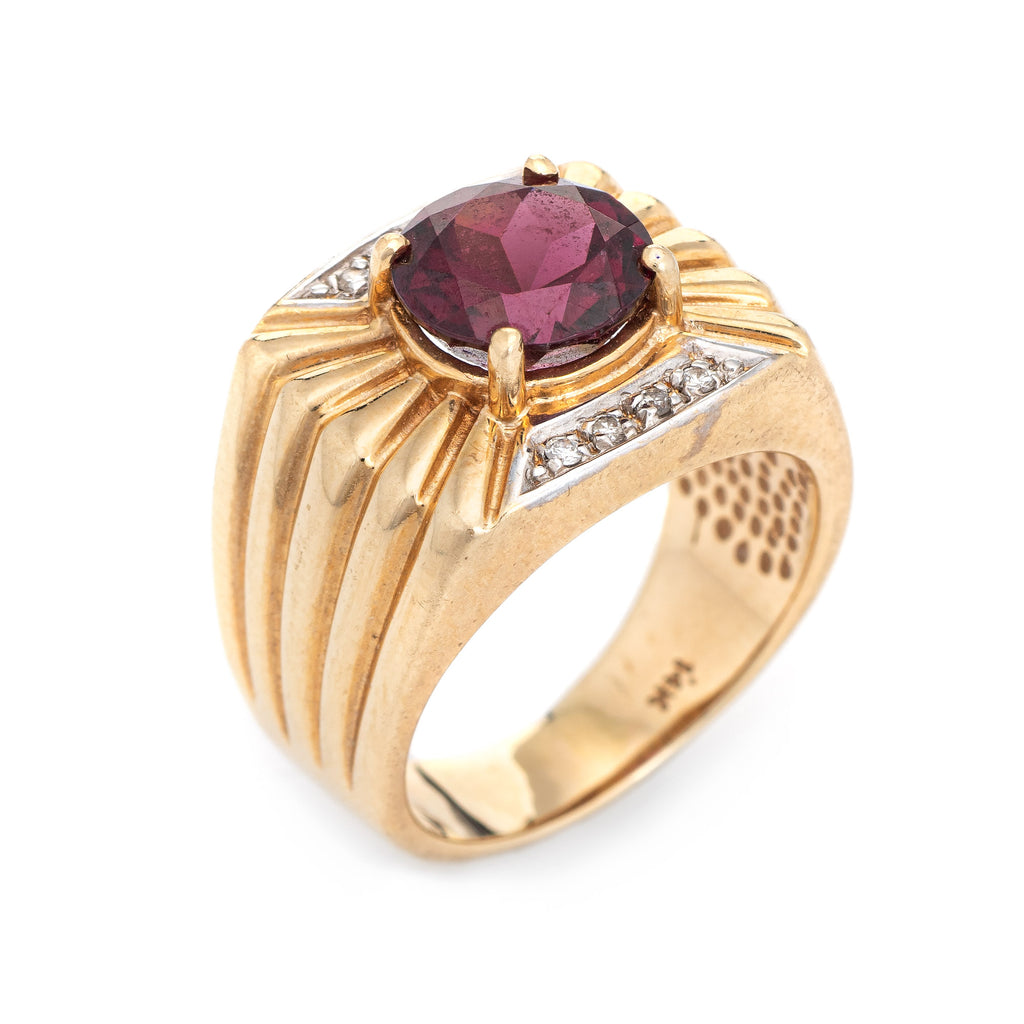 Stylish vintage garnet & diamond ring (circa 1970s to 1980s) crafted in 14 karat yellow gold.
