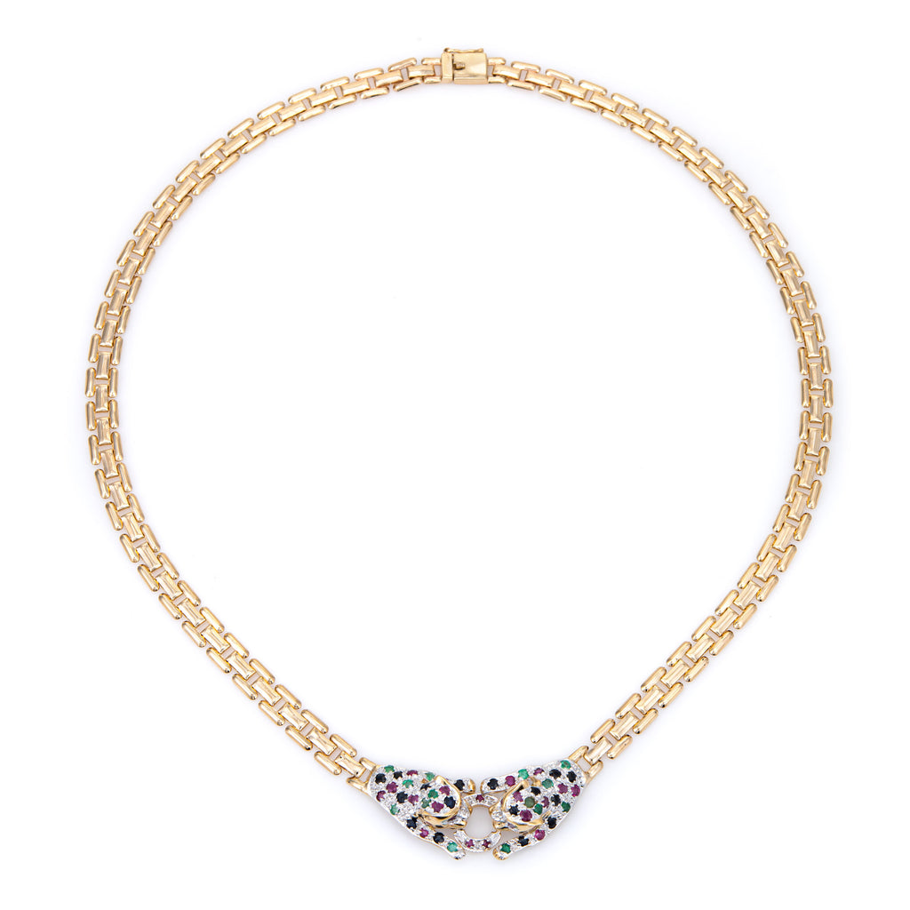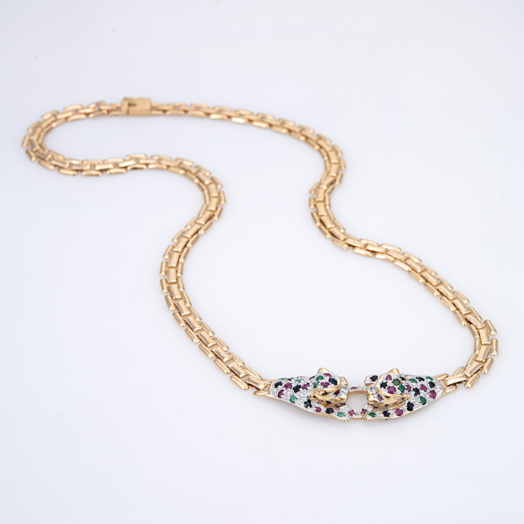 Gemstone Double Leopard Necklace Vintage 14k Gold 15" Choker Fine Animal Jewelry