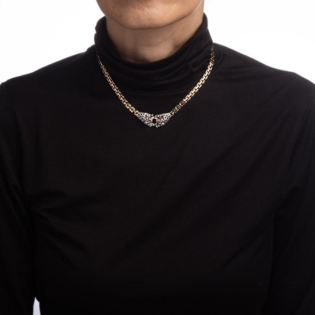The choker length necklace sits nicely at the nape of the necklace, terminating to two leopards at the center of the necklace. It makes a great statement on the neck. Wear it as a single piece or layered with your fine jewelry from any era.