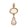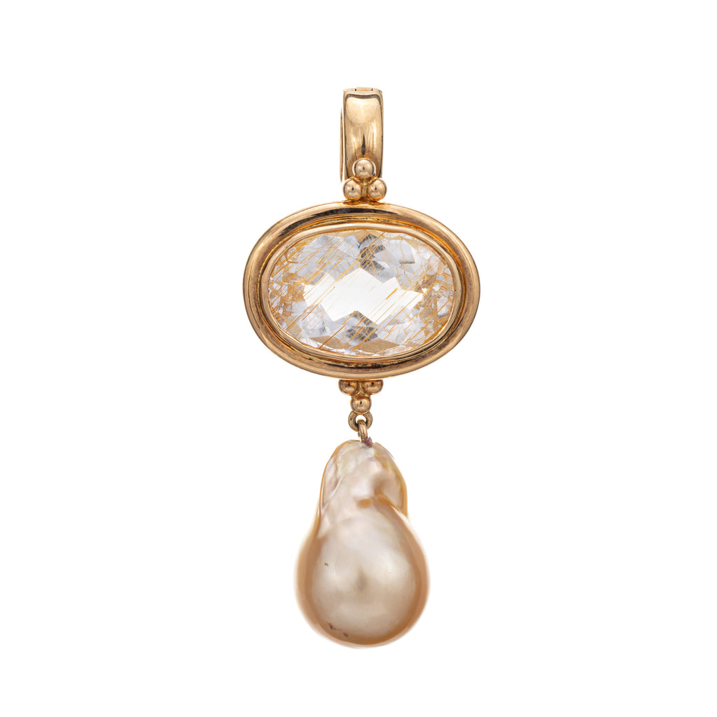 Finely detailed golden baroque pearl & rutilated quartz drop pendant crafted in 14 karat yellow gold (circa 1980s to 1990s).