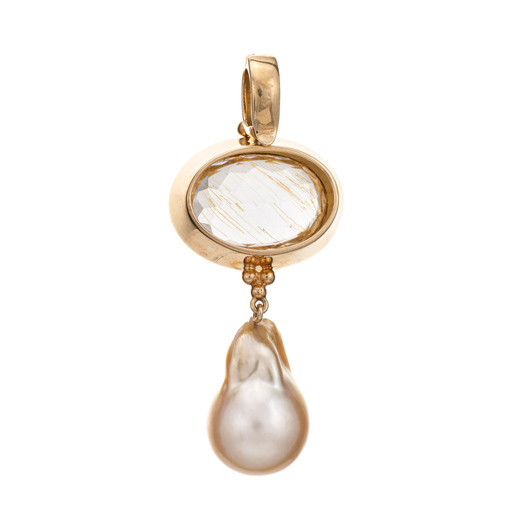 Golden Baroque Pearl Drop Pendant Rutilated Quartz 14k Yellow Gold Jewelry
