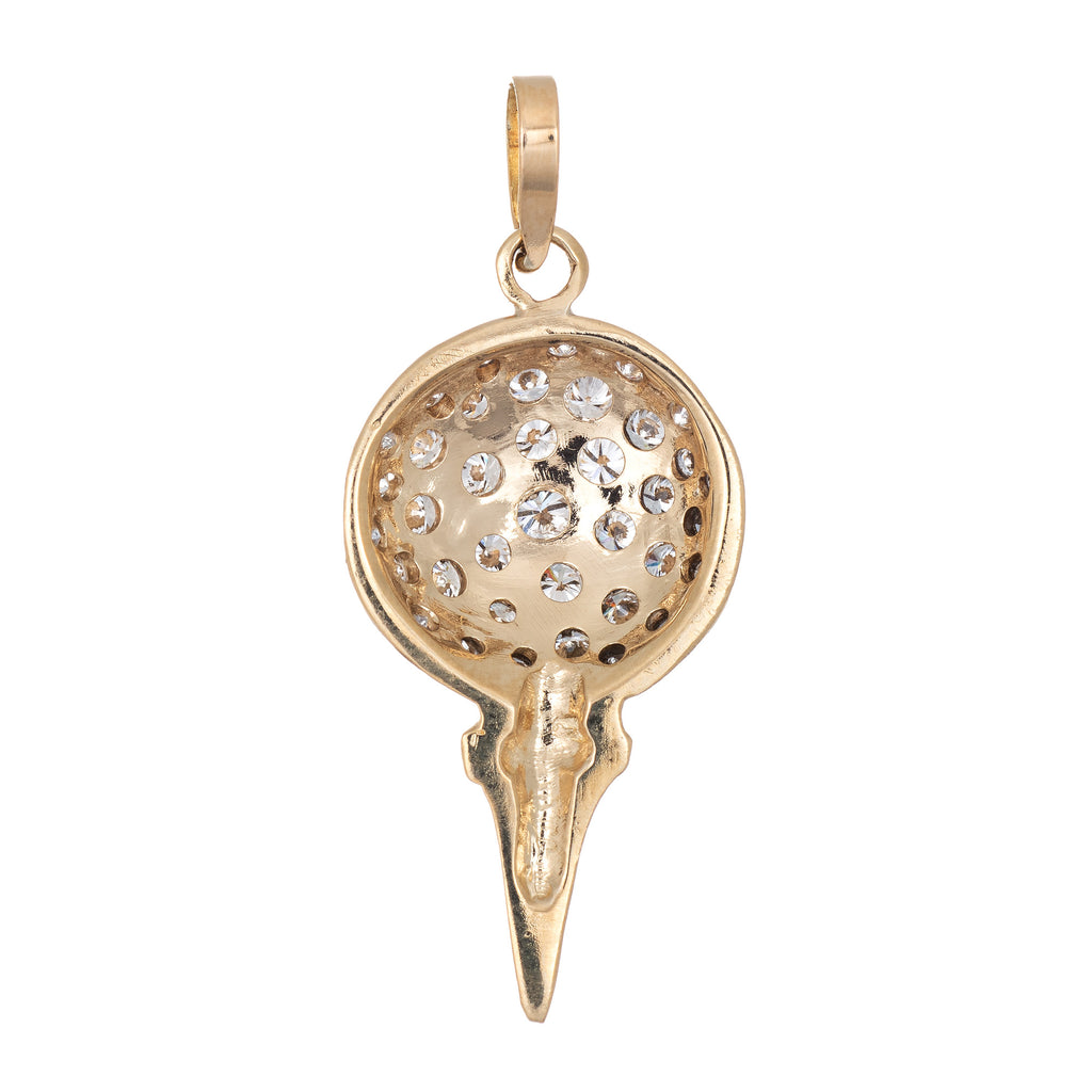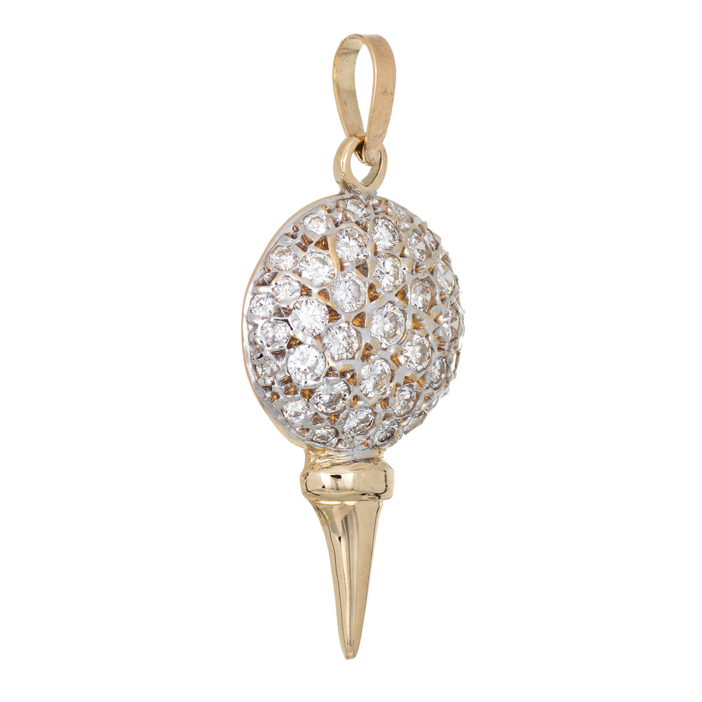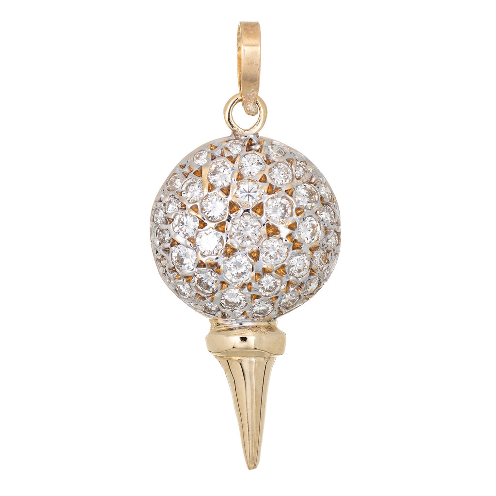 Finely detailed vintage diamond golf ball on a tee charm or pendant crafted in 14k yellow gold.