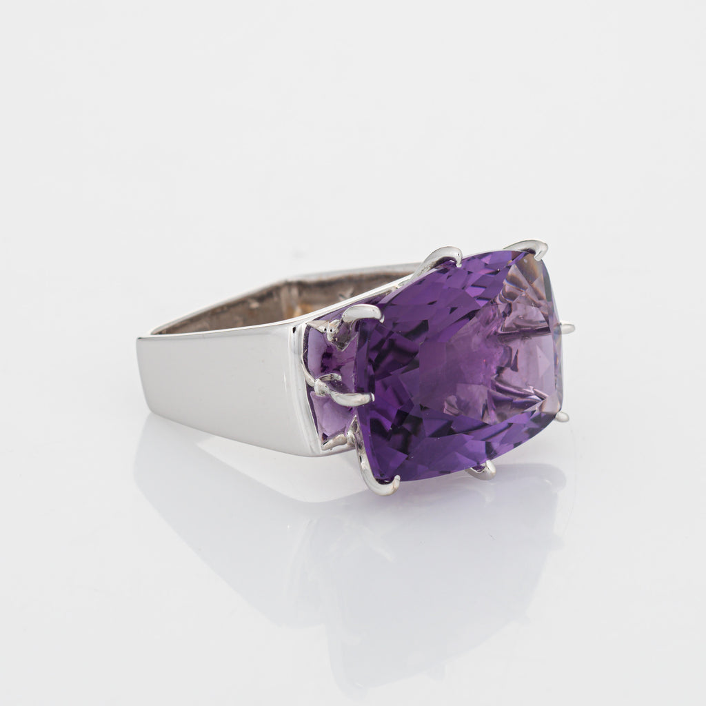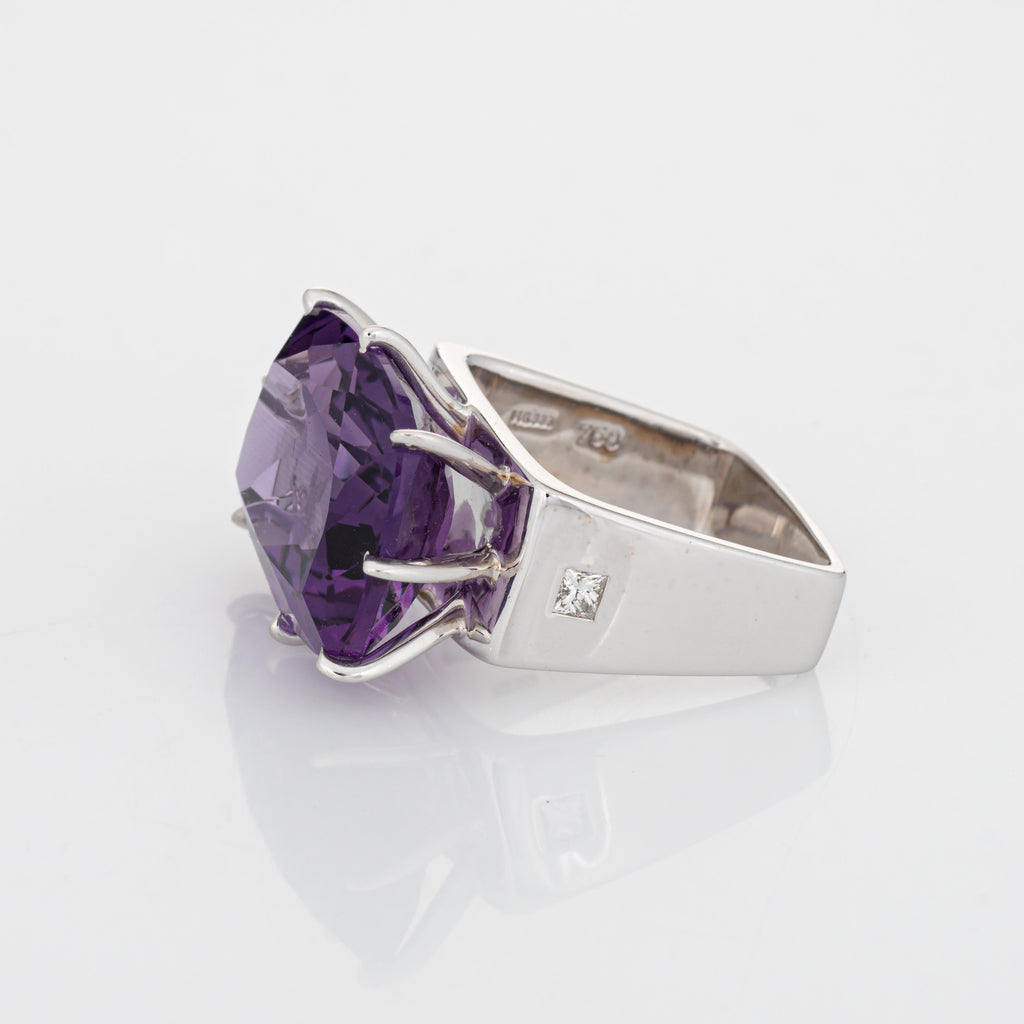 Stones: Cushion cut amethyst is estimated at 10.50 carats. The amethyst is in excellent condition and free of cracks or chips. One estimated 0.03 carat princess cut diamond is set to the side shoulder.