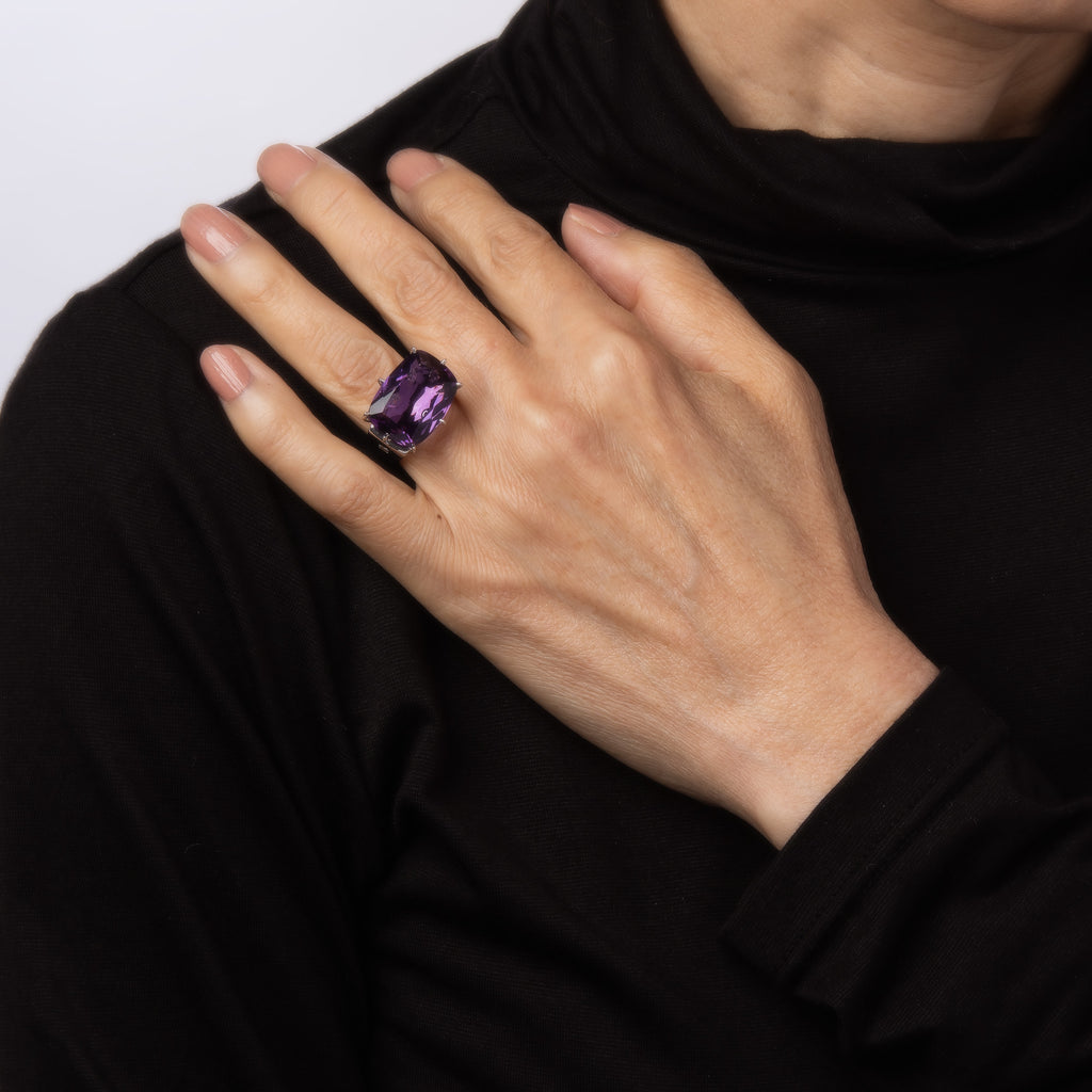 From the Sunrise collection the large amethyst is set in an east-west position upon a square band. The cocktail ring makes a nice statement on the hand. The medium rise ring (9mm - 0.35 inches) sits comfortably on the finger.