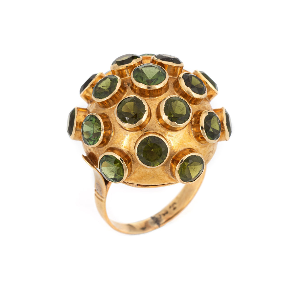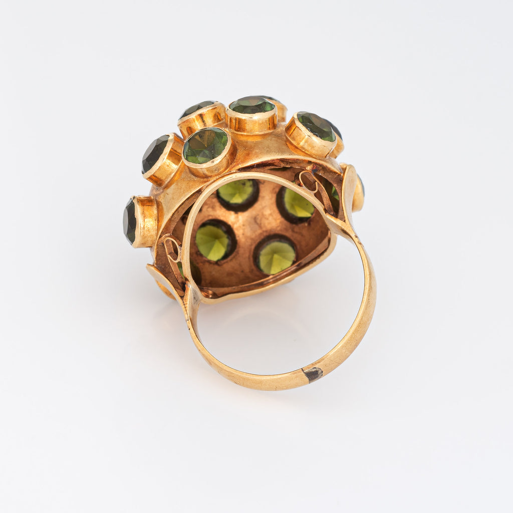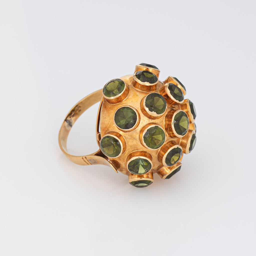 Ornate H Stern sputnik domed peridot cocktail ring (circa 1950s to 1960s), crafted in 18 karat yellow gold.