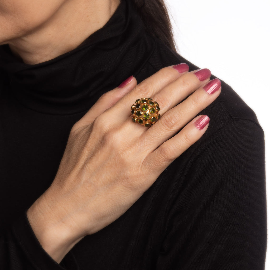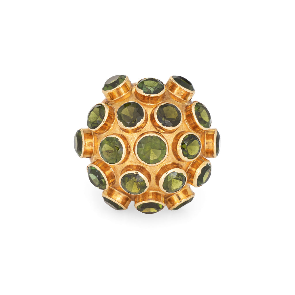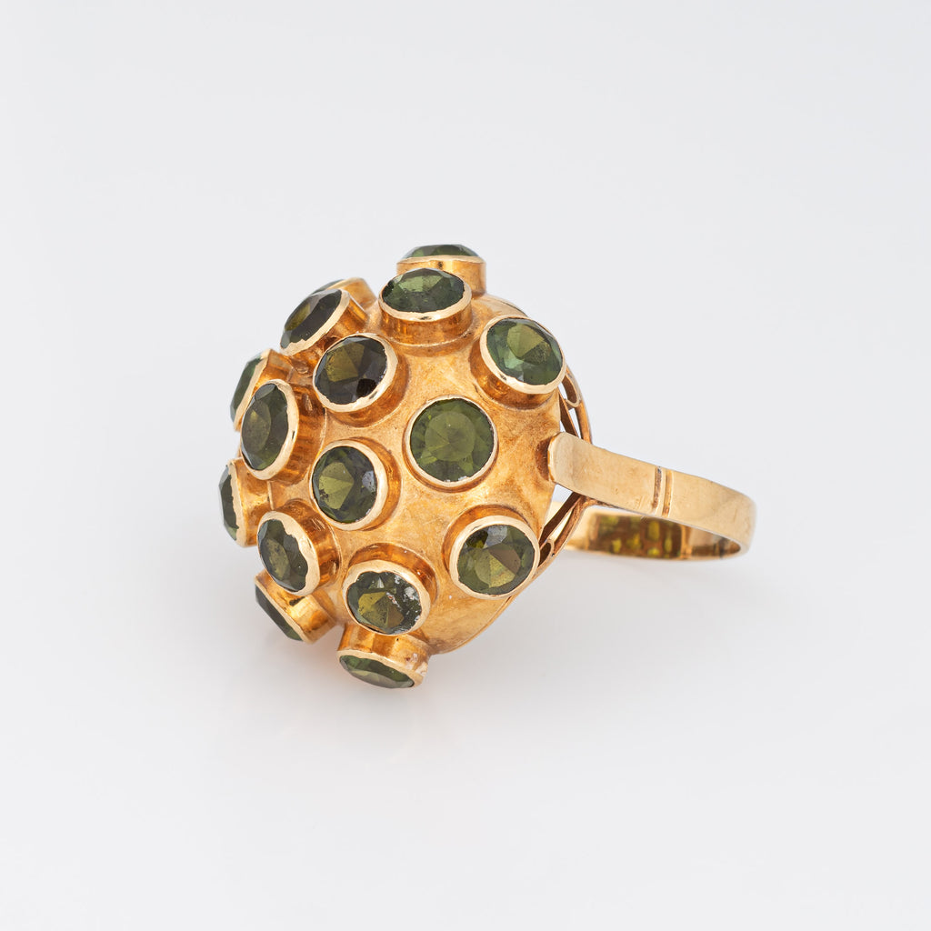 Ornate H Stern sputnik domed peridot cocktail ring (circa 1950s to 1960s), crafted in 18 karat yellow gold.