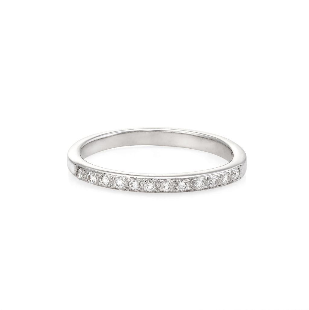 The simple and sweet band is set with diamonds half way around the band. Great worn alone or stacked with your jewelry from any era.