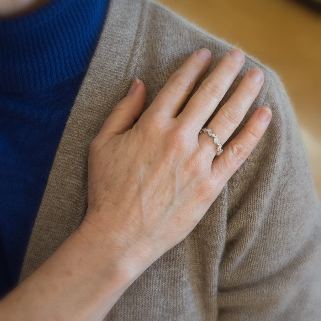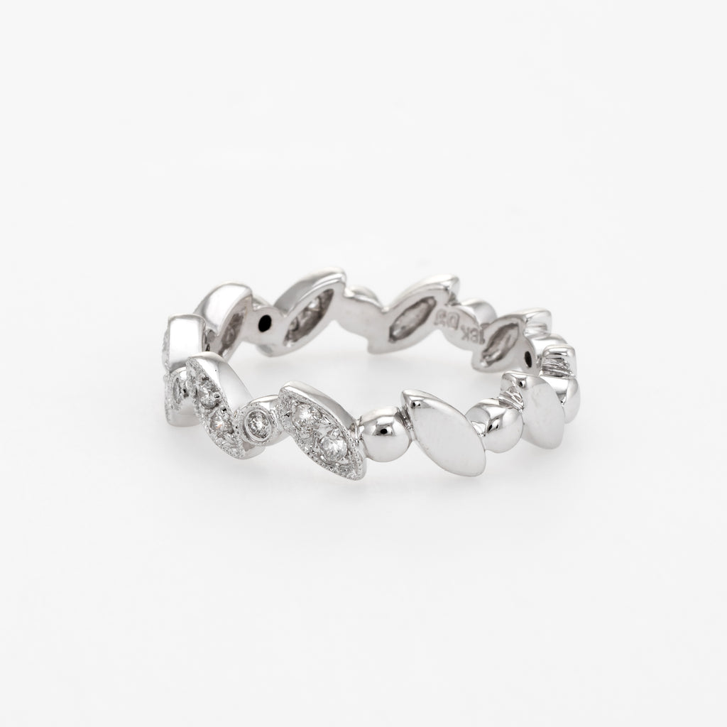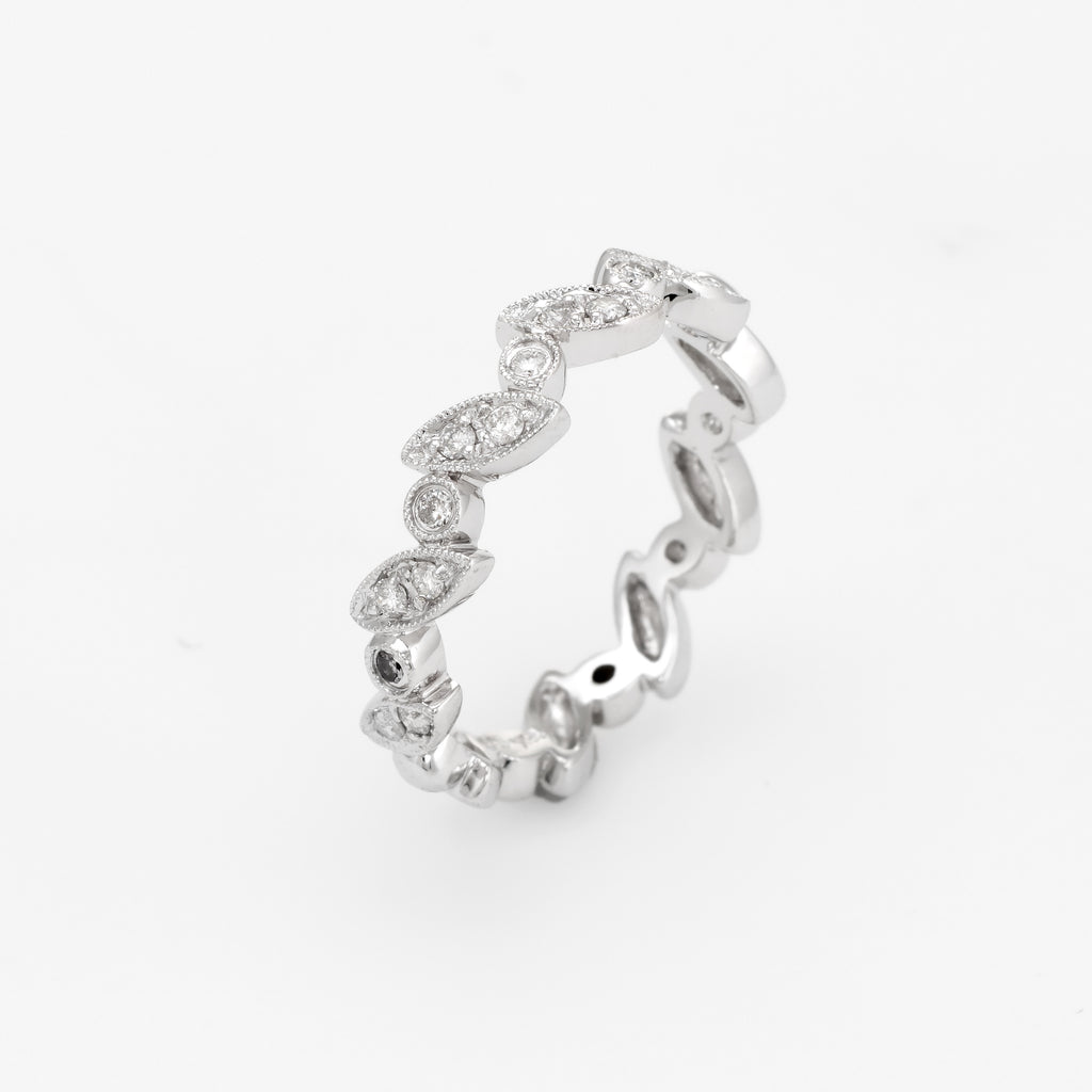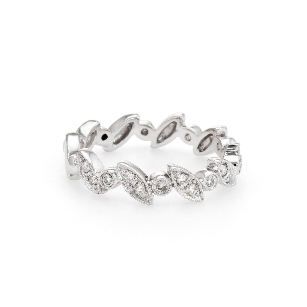 The elegant band is set with a visually appealing alternating pattern of marquise and round diamond set mounts. The ring is great worn alone or stacked with your fine jewelry from any era. The low rise band (2mm - 0.07 inches) sits comfortably on the finger.