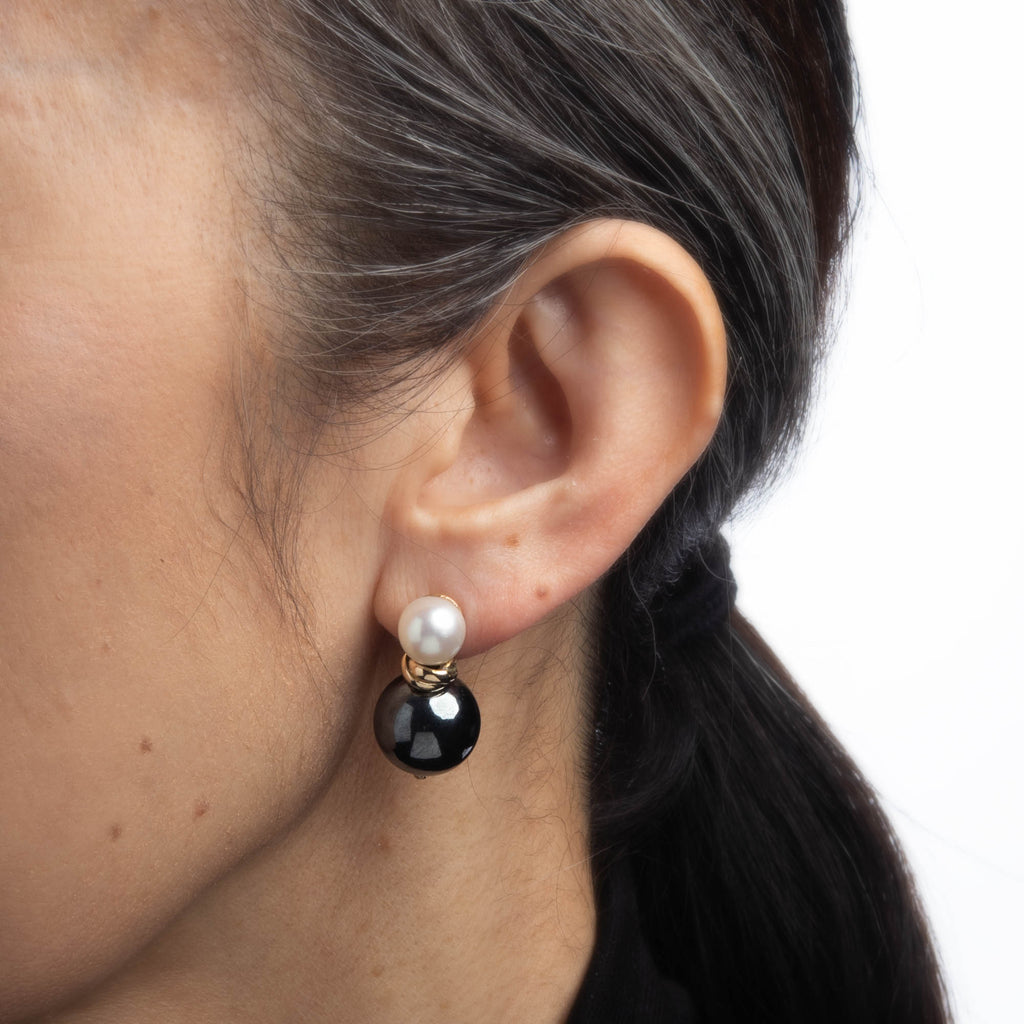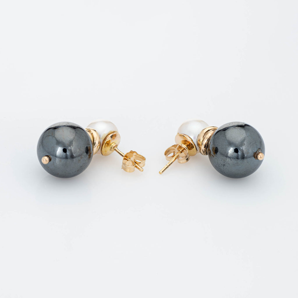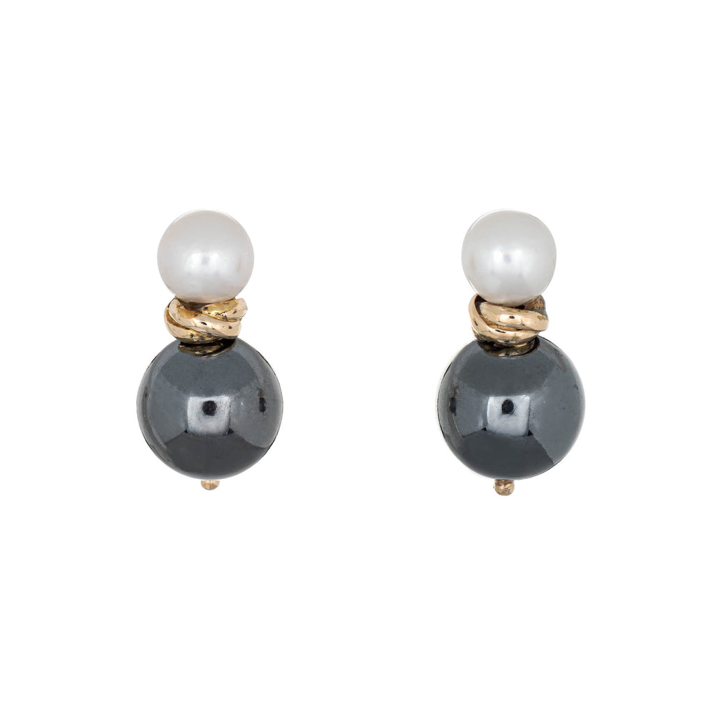 Stylish pair of vintage hematite & cultured pearl earrings crafted in 9k yellow gold (circa 1980s to 1990s).