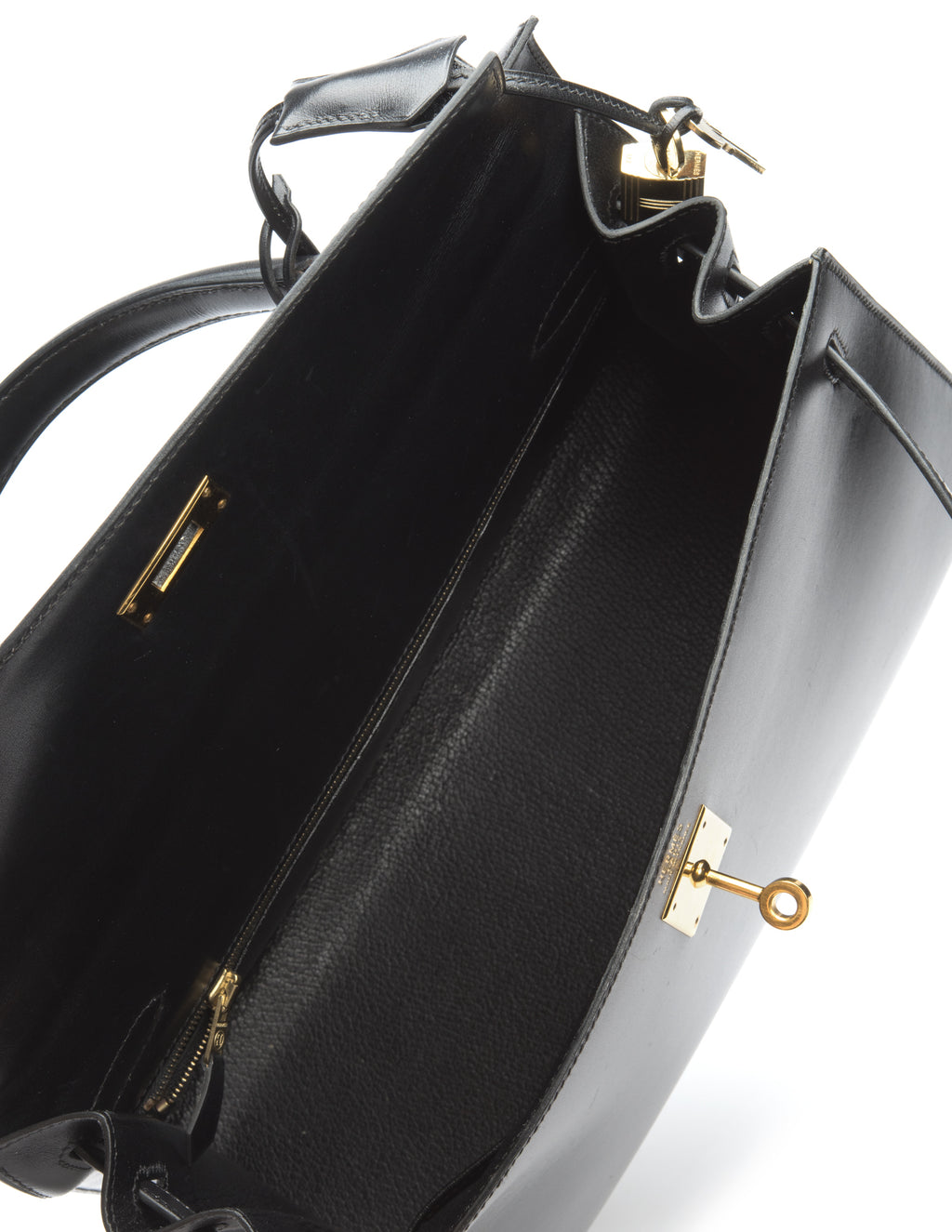 The black (noir) box calf leather bag is circa 1971. The bag was in need of some TLC and was sent to the Hermes workshop in Paris, France. The bag underwent the following: