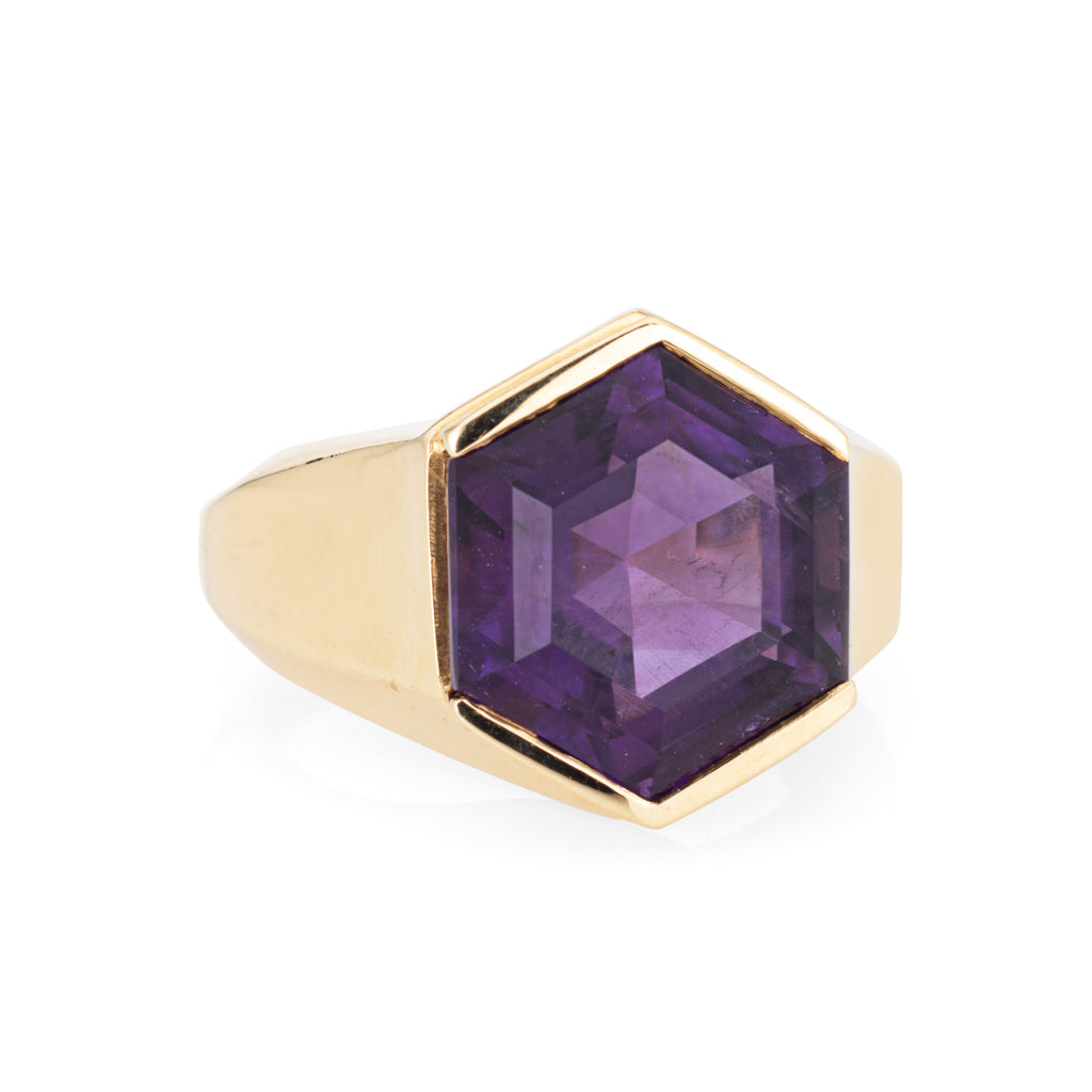 Stones: Hexagonal cut amethyst measures 13mm diameter. The amethyst is in very good condition and free of cracks or chips.