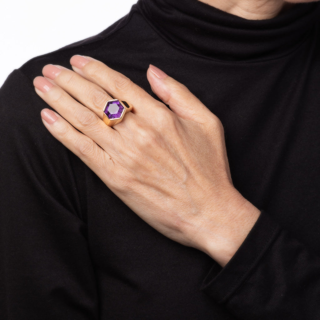 The stylish hexagonal shaped ring makes a great statement on the hand! The bezel setting securely holds the amethyst with the lower profile ring (rising 9.5mm from the finger) for a comfortable fit on the hand.
