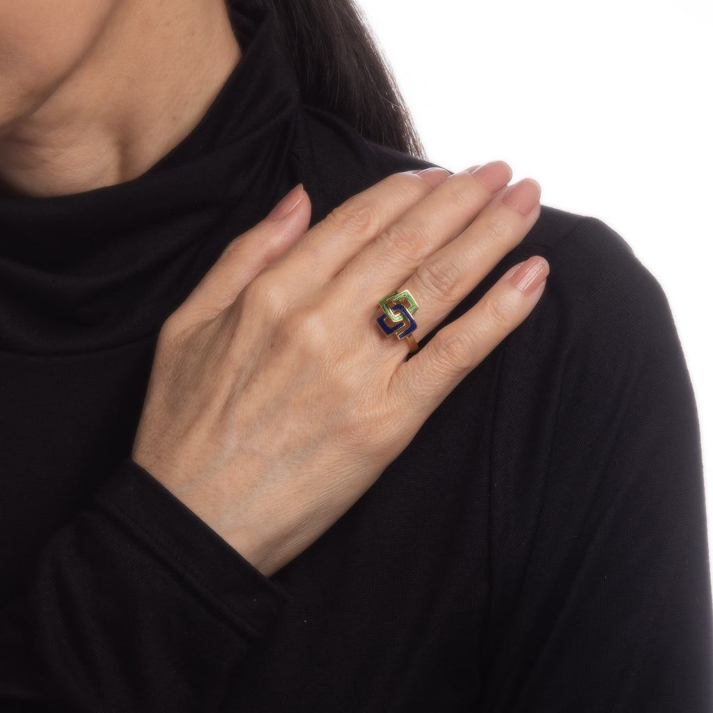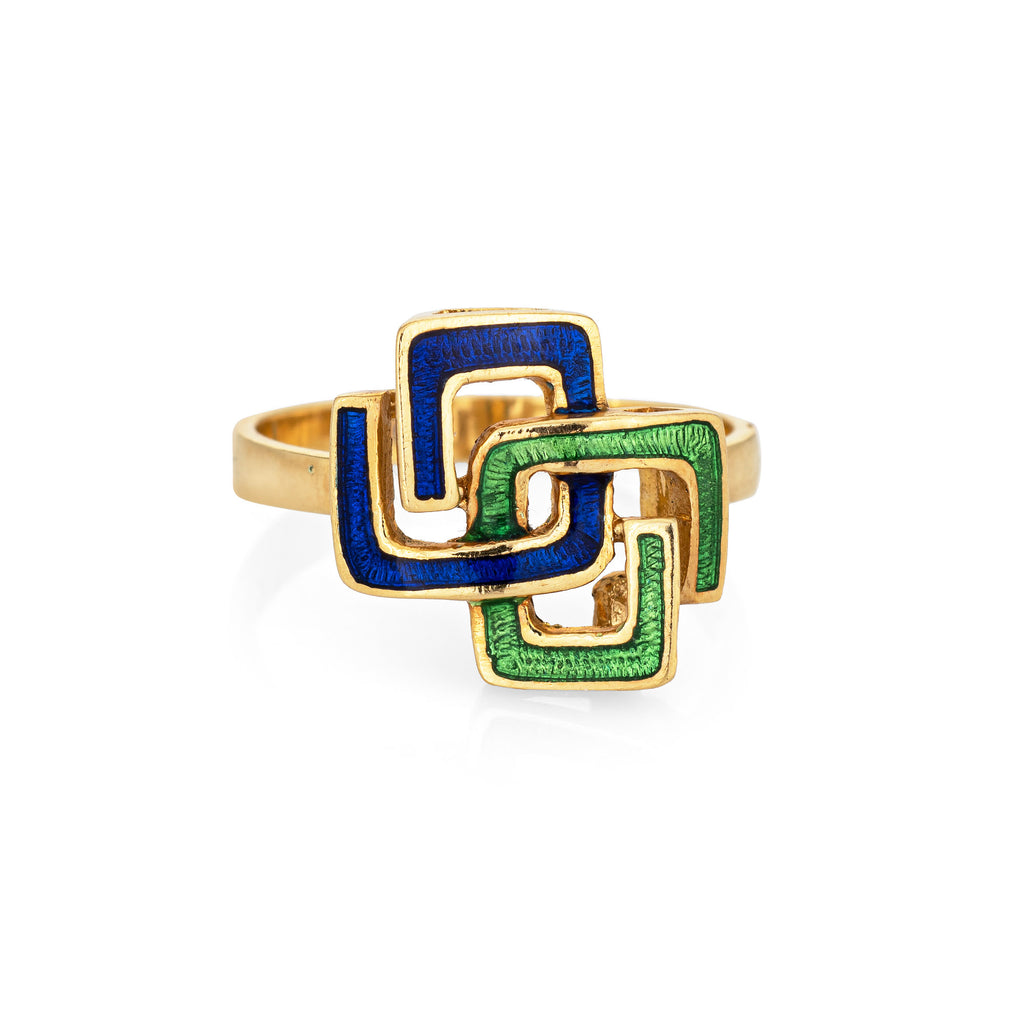 Green and blue enamel is set into the interlocking squares. Great for wear alone or stacked with your fine jewelry from any era.