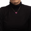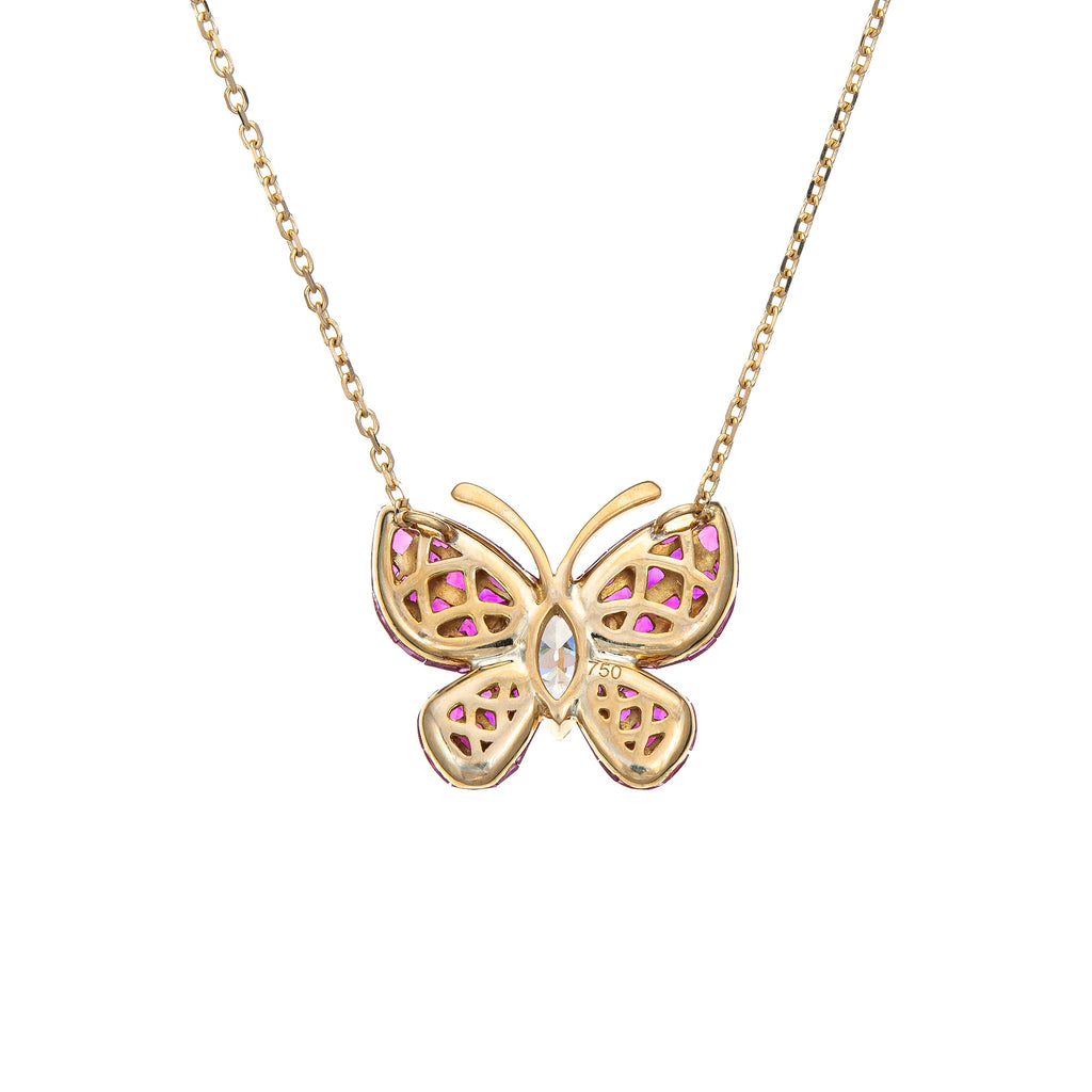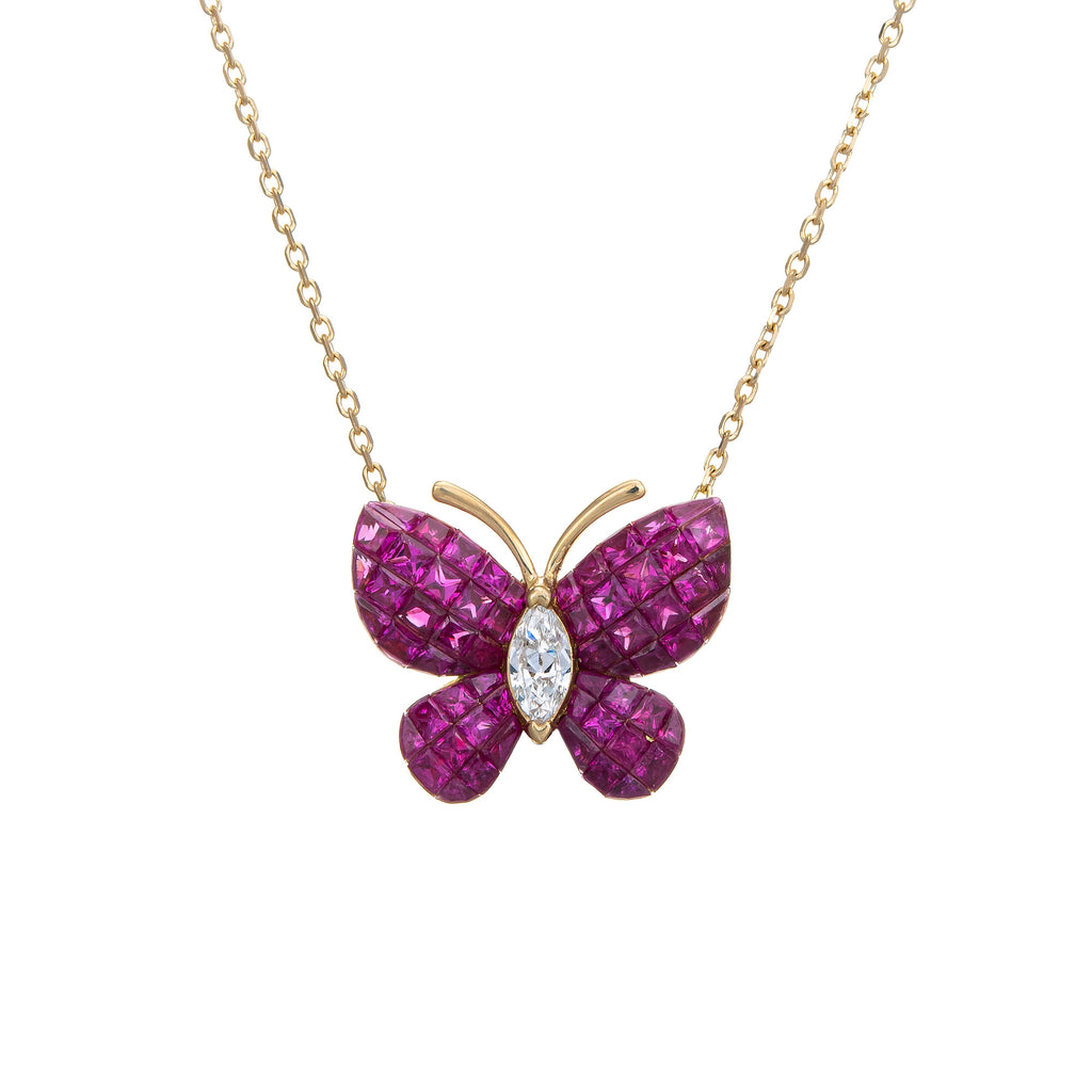 Finely detailed invisible set ruby & diamond butterfly necklace crafted in 18 karat yellow gold.