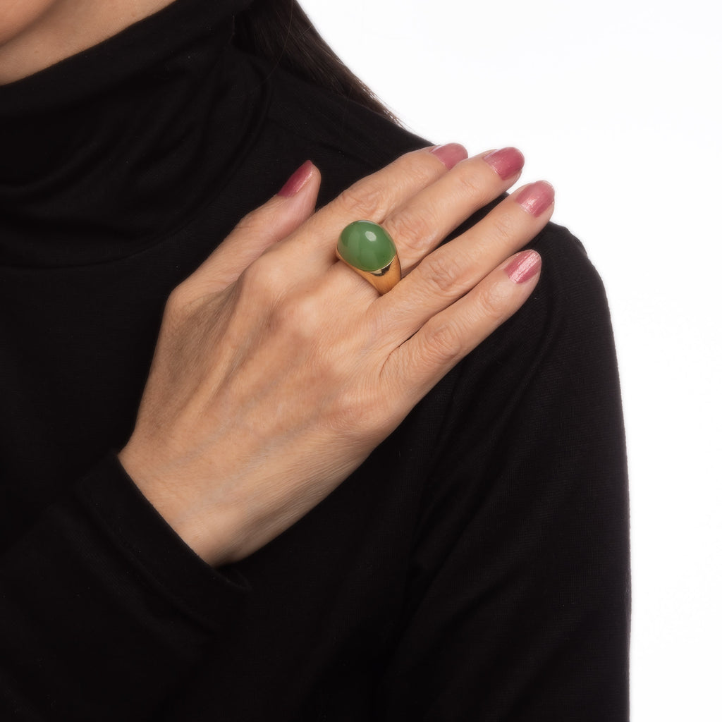 The jade is cabochon cut in a pointed dome and makes a great statement on the hand. The medium rise ring (12mm - 0.47 inches) sits comfortably on the finger. Weighing 15.8 grams (just over 1/2 ounce) the ring has a nice weighty feel on the finger.