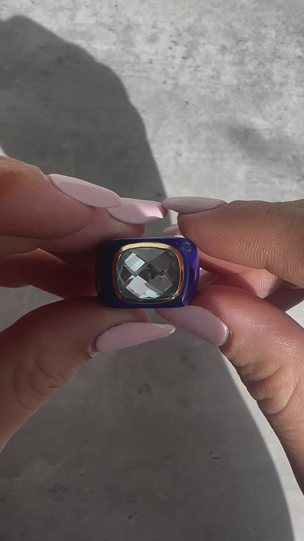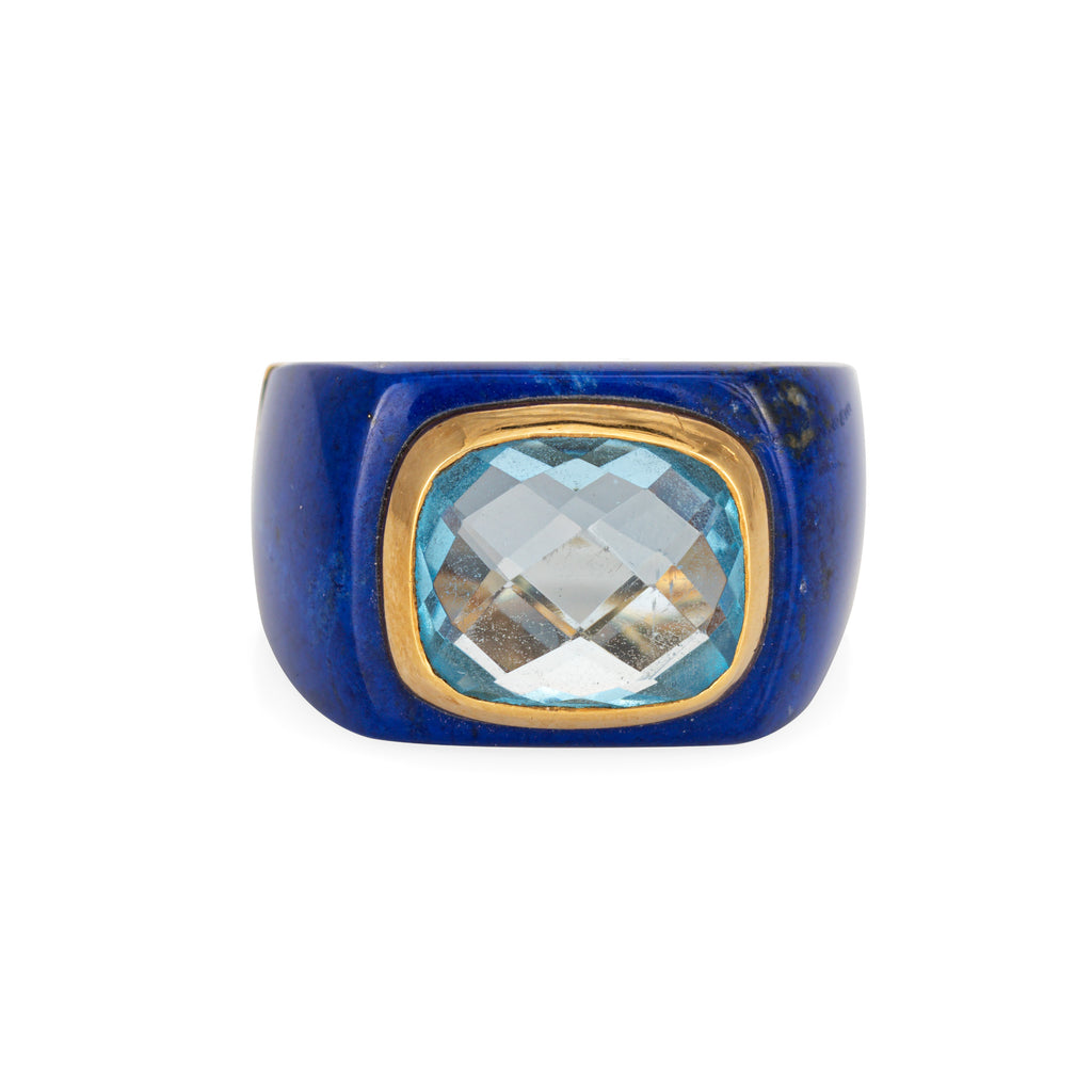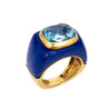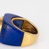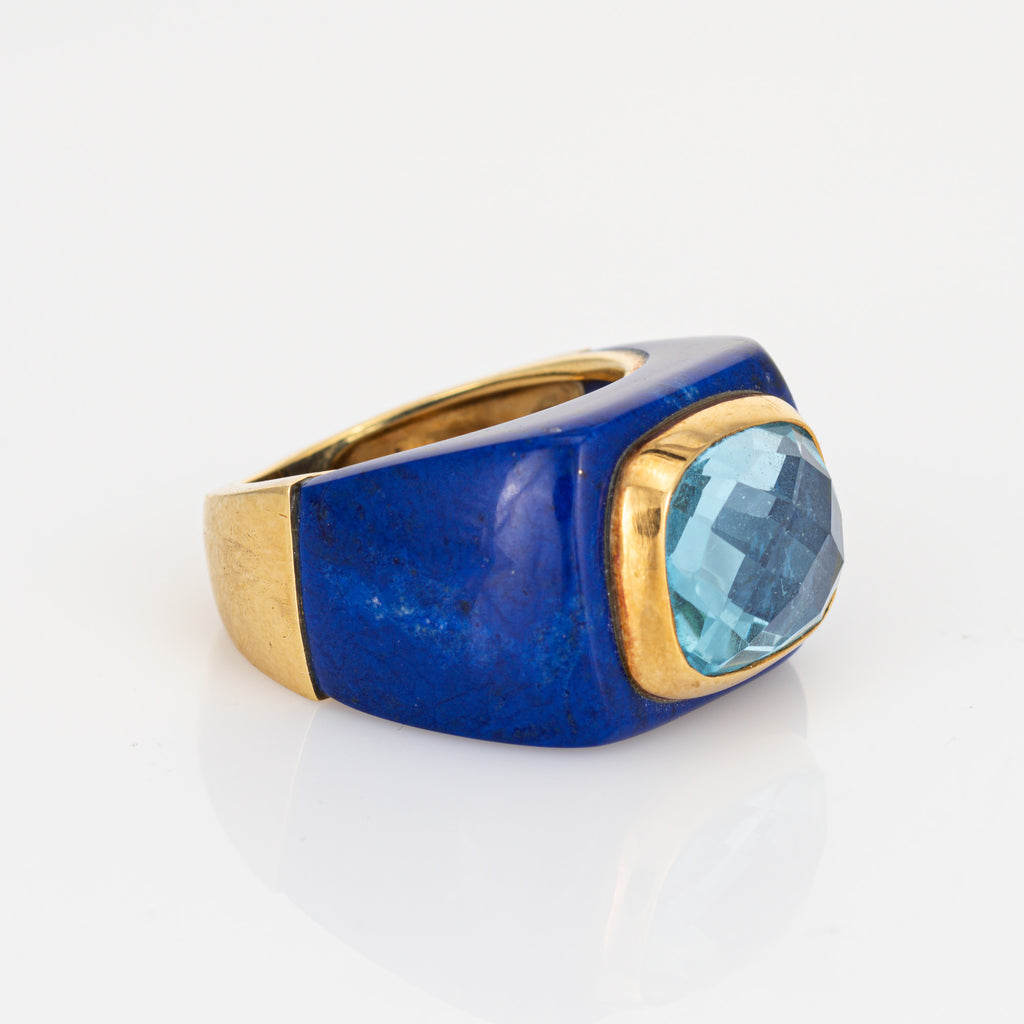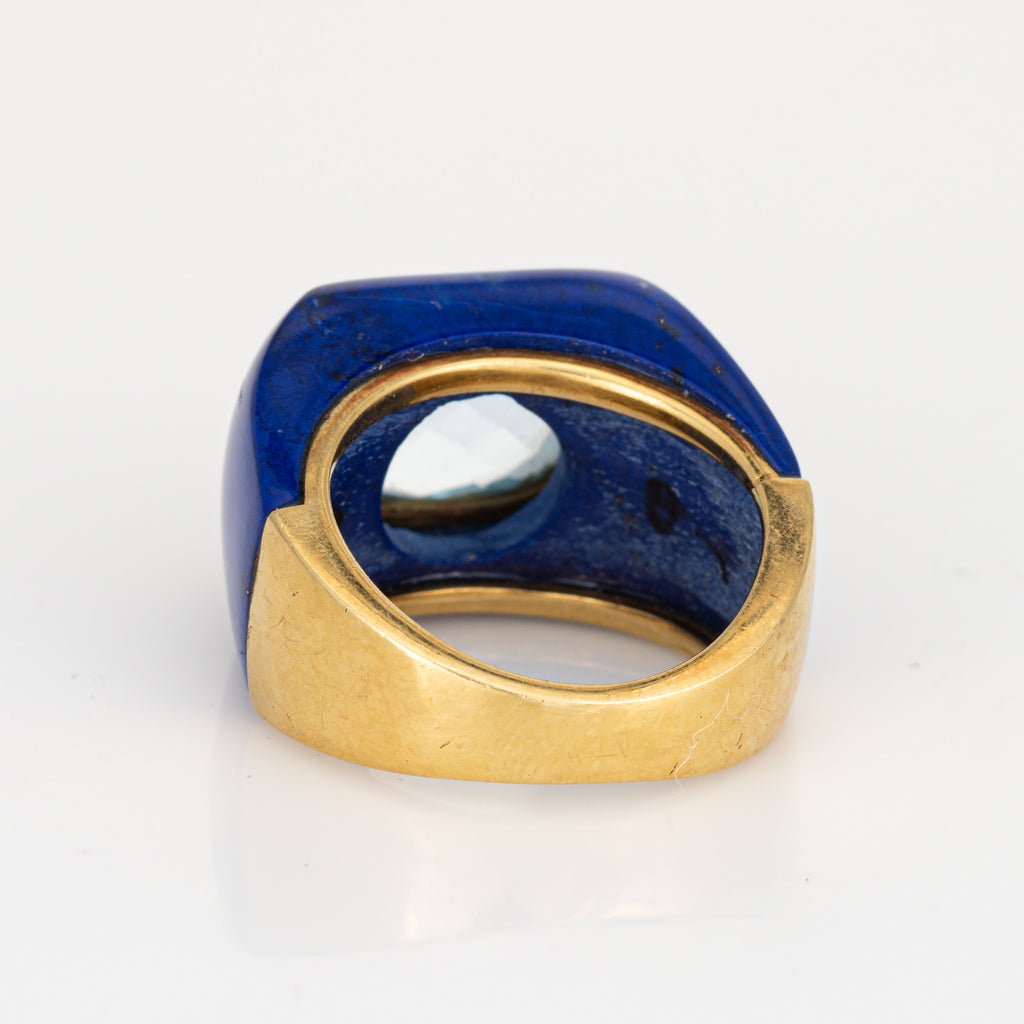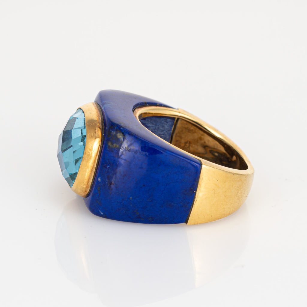 Stylish contemporary estate lapis lazuli & blue topaz cocktail ring crafted in 18 karat yellow gold.