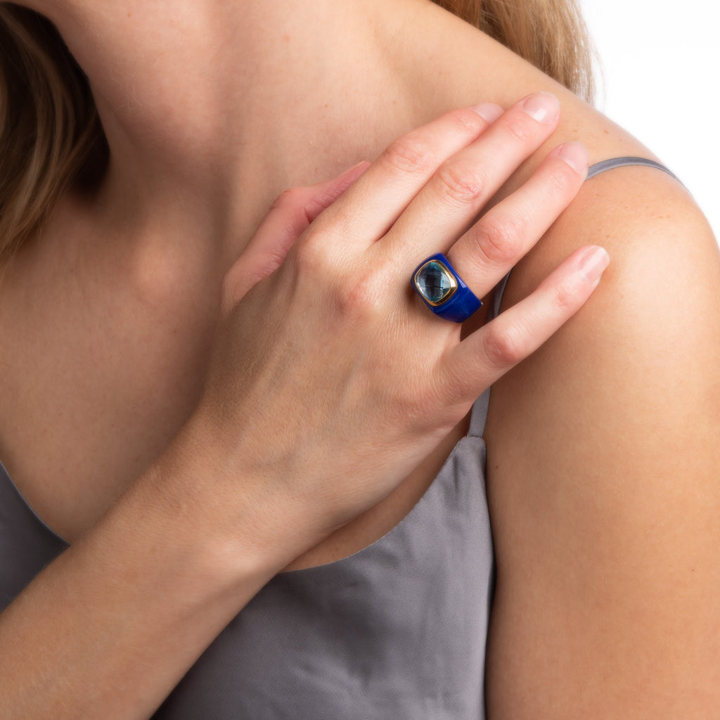Beautiful shades of blue make this ring a standout! Checkerboard faceted blue topaz shimmers with every movement. The medium rise ring (10mm - 0.39 inches) sits comfortably on the finger.