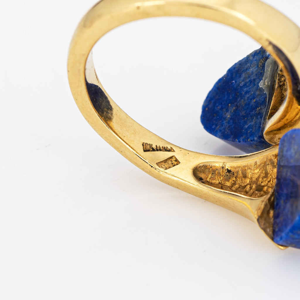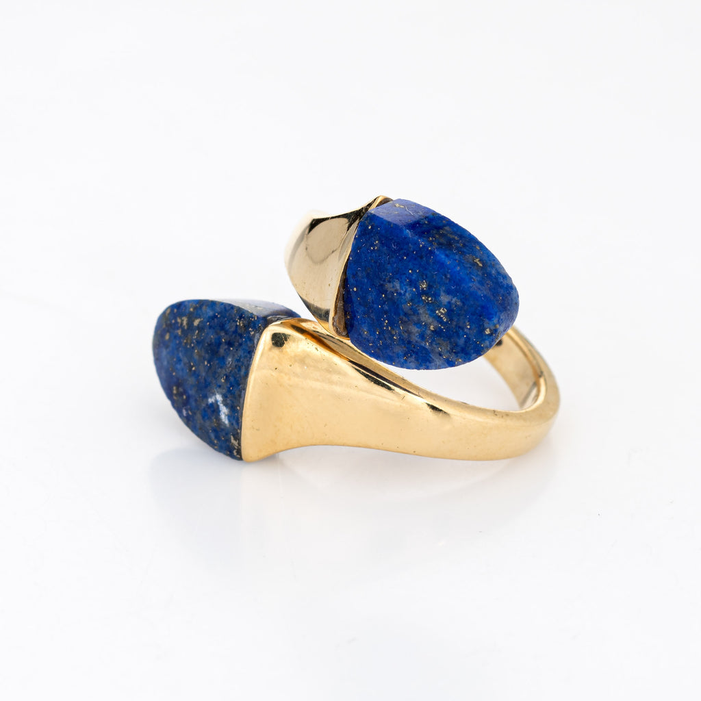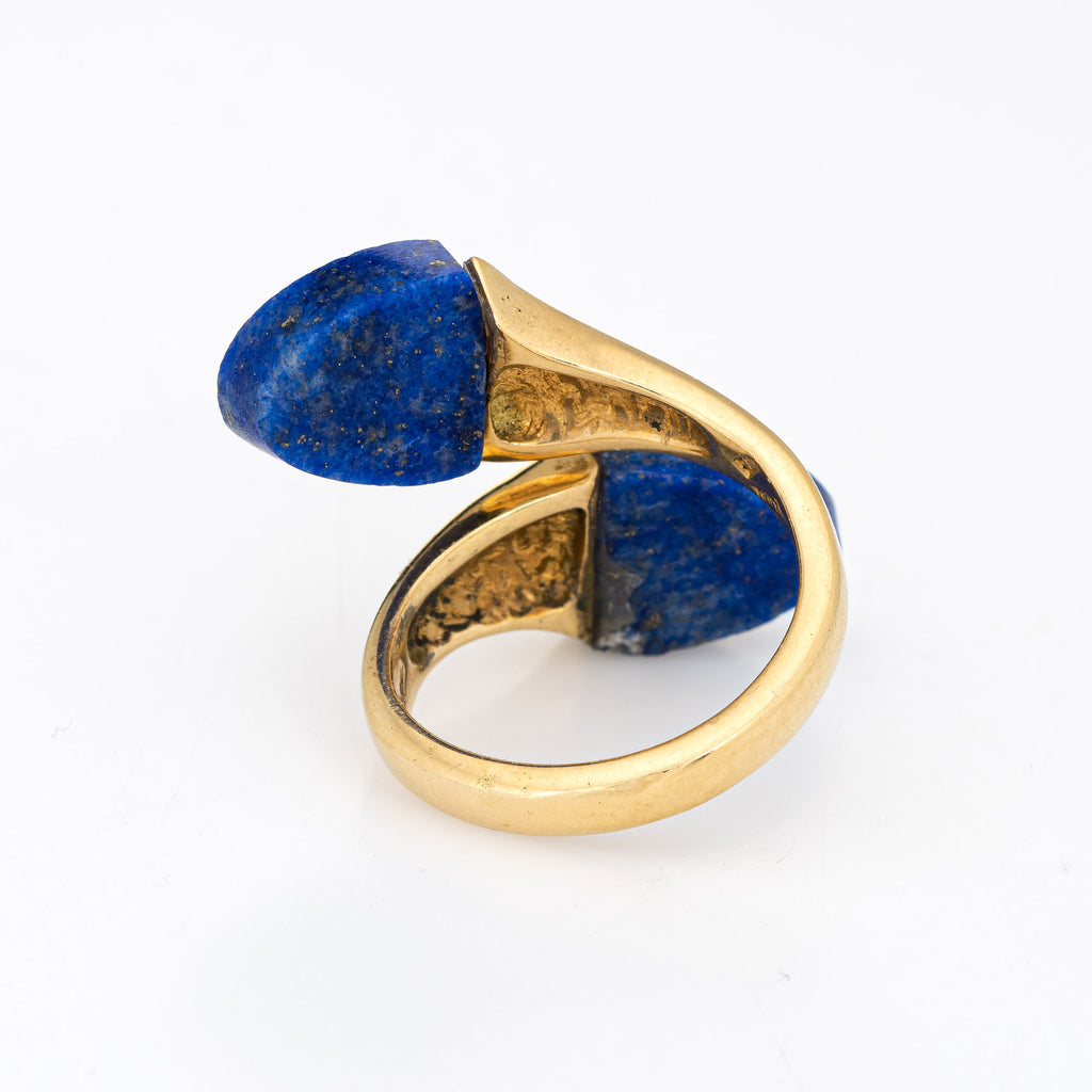 Stylish vintage lapis lazuli bypass ring (circa 1970s to 1980s) crafted in 18 karat yellow gold.