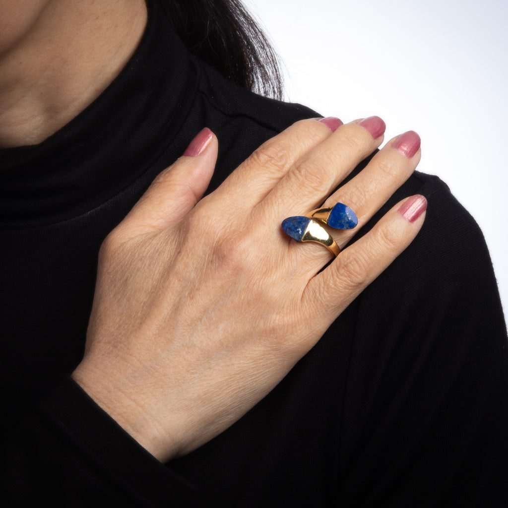 The lapis lazuli is set in a bypass design or 'Moi et Toi', a French term for 'you and me'. The ring makes a nice statement on the hand. The low rise ring (5mm - 0.19 inches) sits comfortably on the finger.
