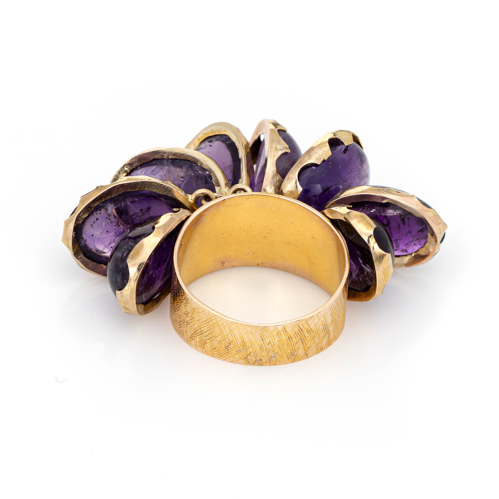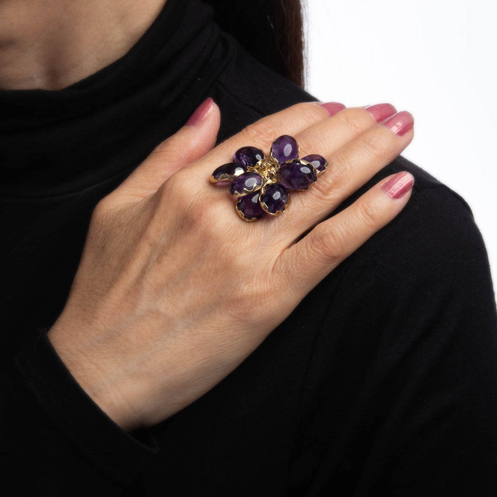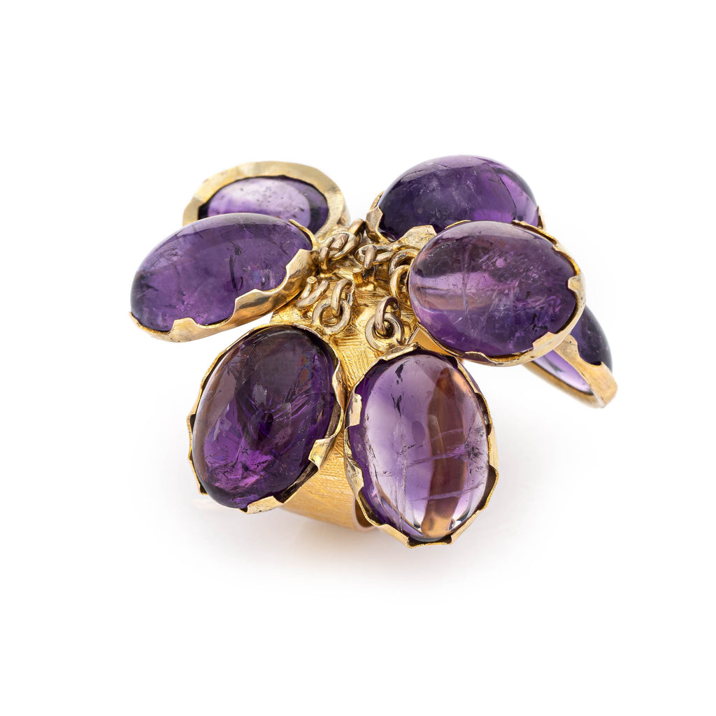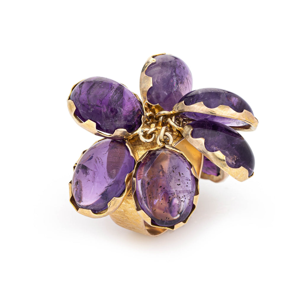 The fun and fabulous ring features 8 separate amethyst cabochons, securely attached to the band. The charms move freely on the hand with every movement of the ring.