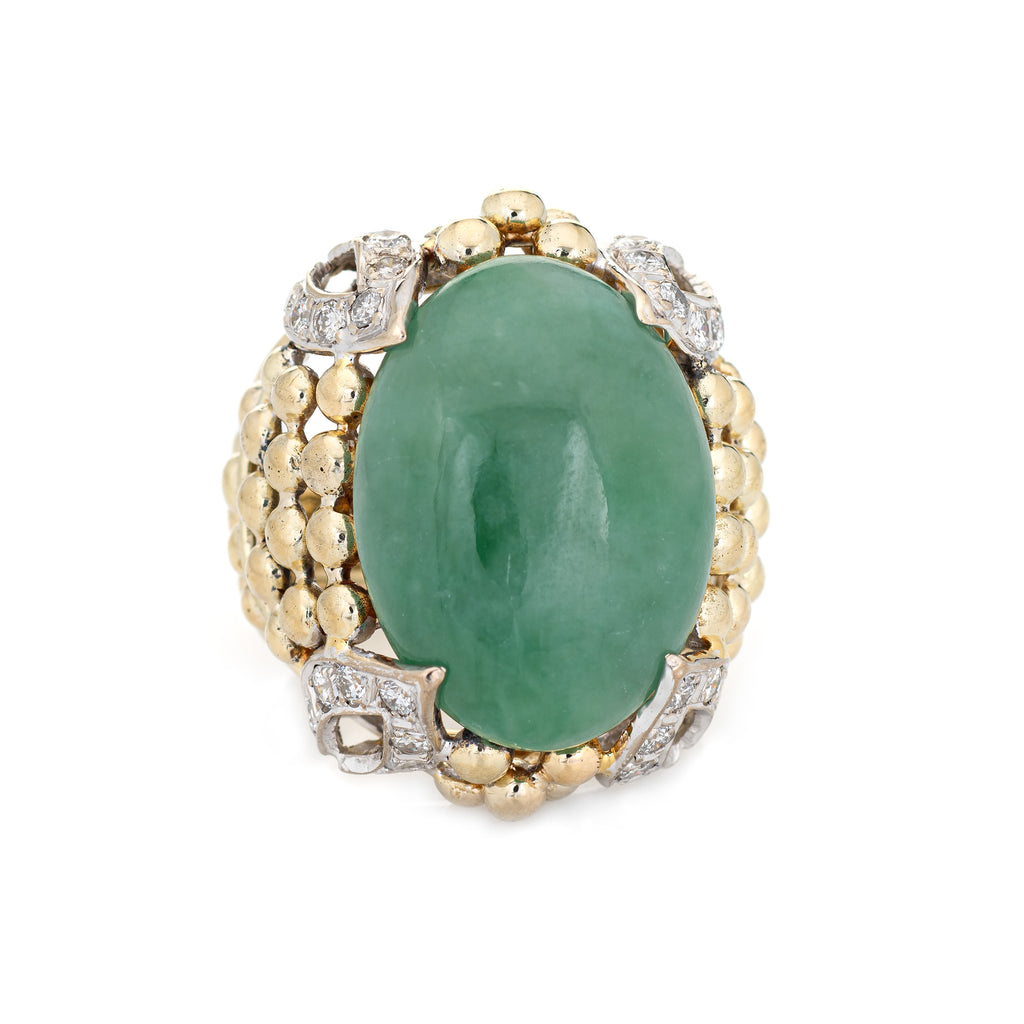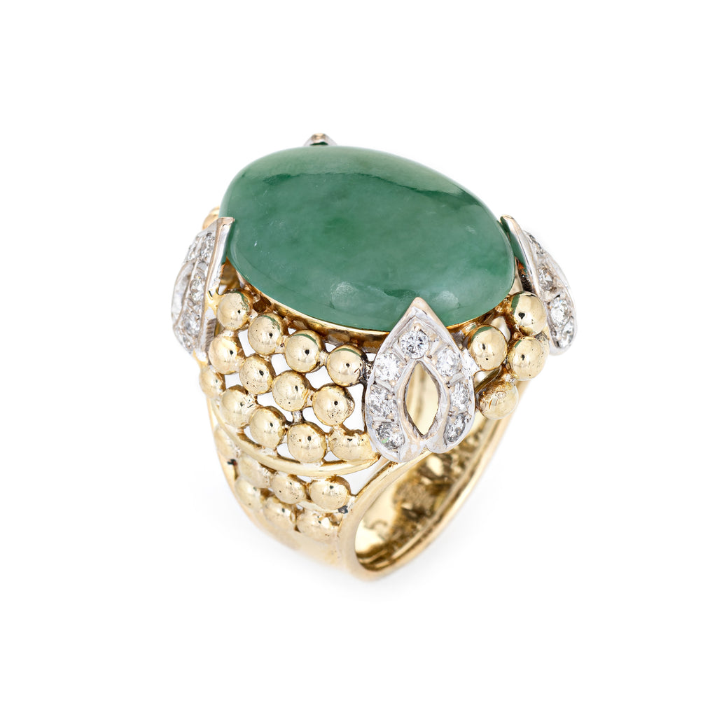 Stylish vintage jade & diamond cocktail ring (circa 1960s) crafted in 18 karat yellow gold.
