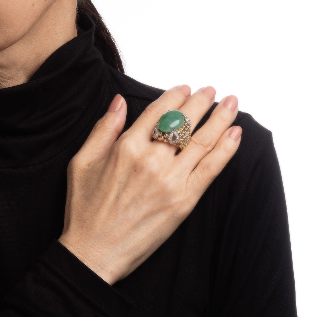 The jade is perched in a large oval mount with raised beaded detailing to the mount. The cocktail ring makes a great statement on the hand. The medium rise ring (12mm - 0.47 inches) sits comfortably on the finger.