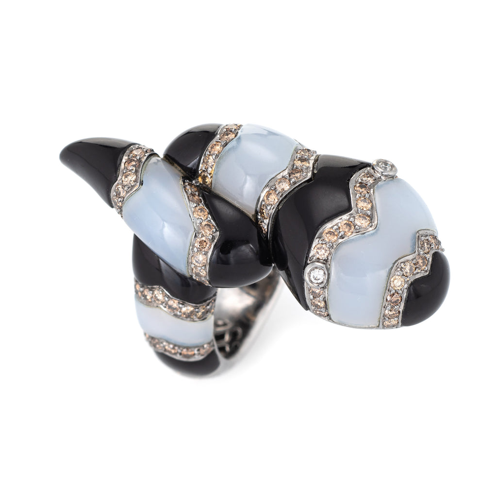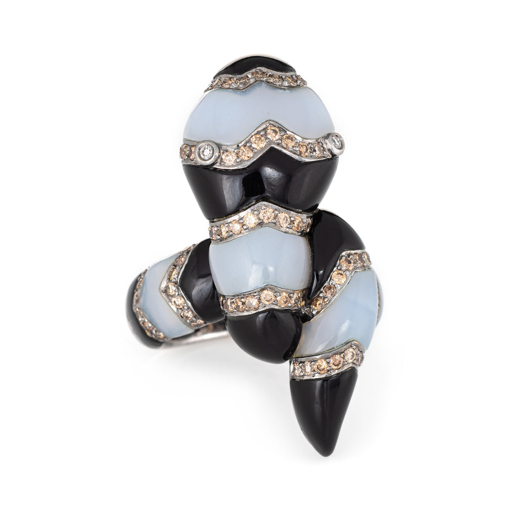 Large snake ring set with black onyx, white chalcedony and diamonds crafted in 18 karat white gold.