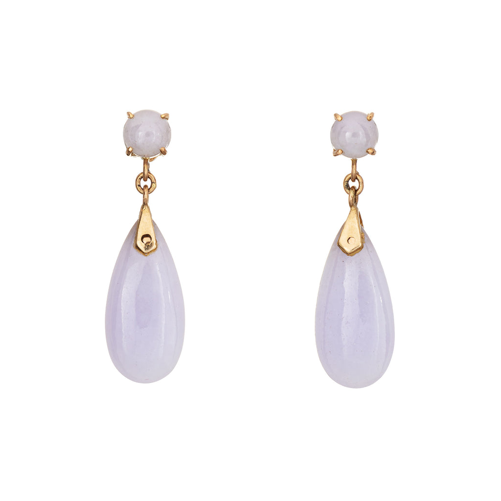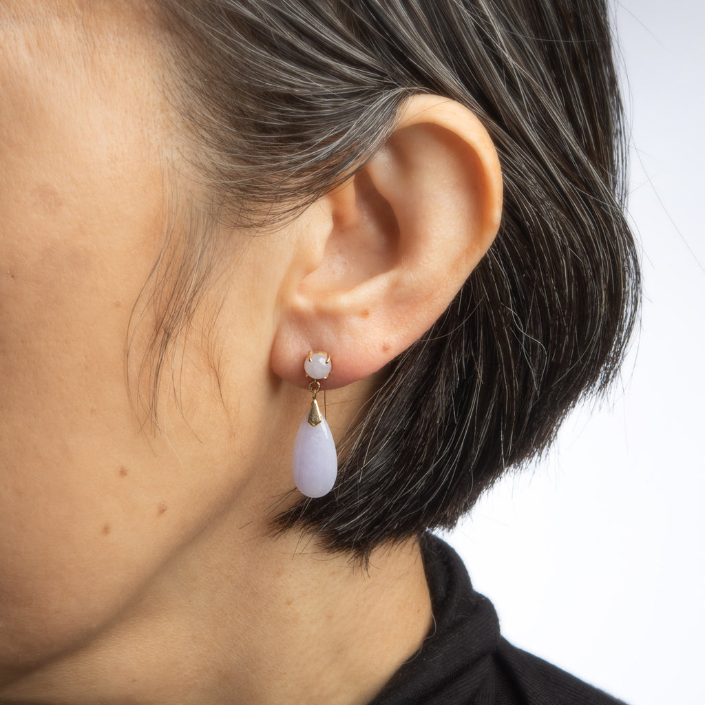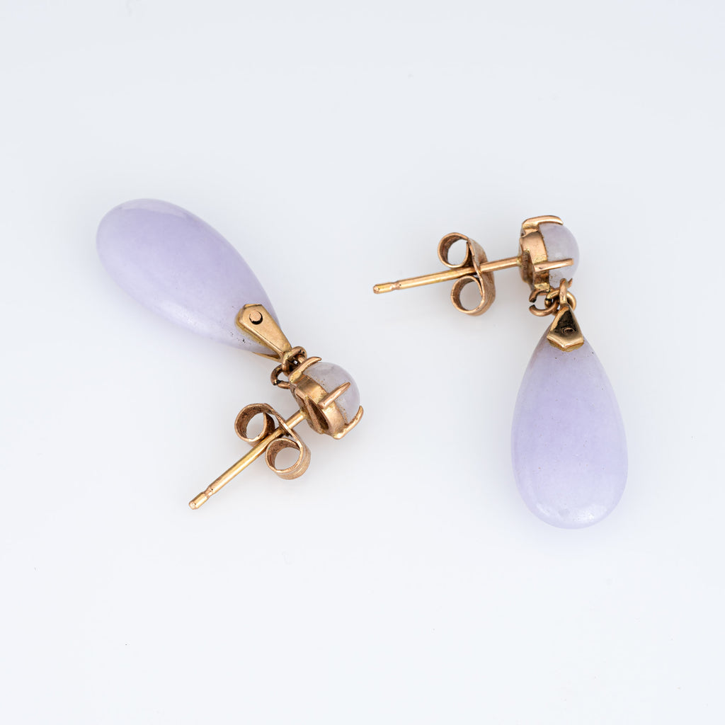 Elegant pair of vintage lavender jade drop earrings (circa 1950s to 1960s) crafted in 14k yellow gold.