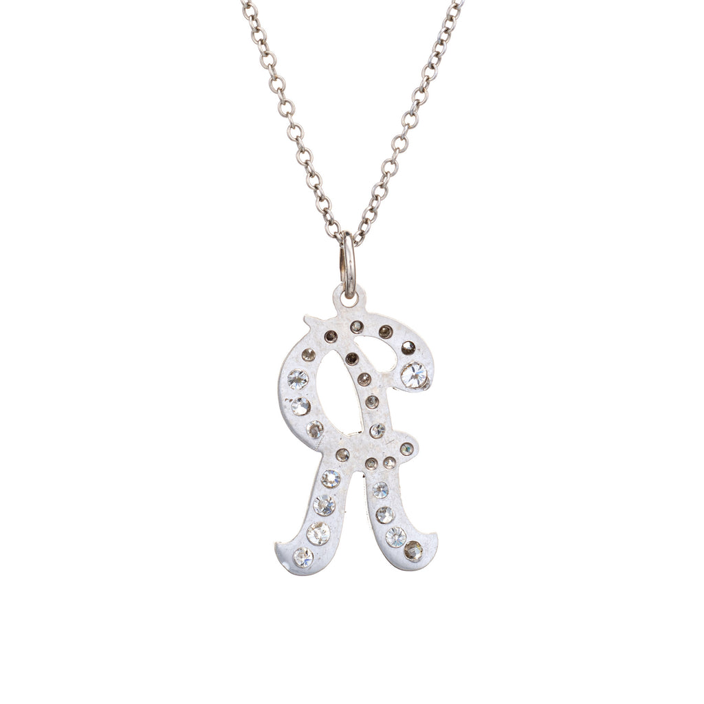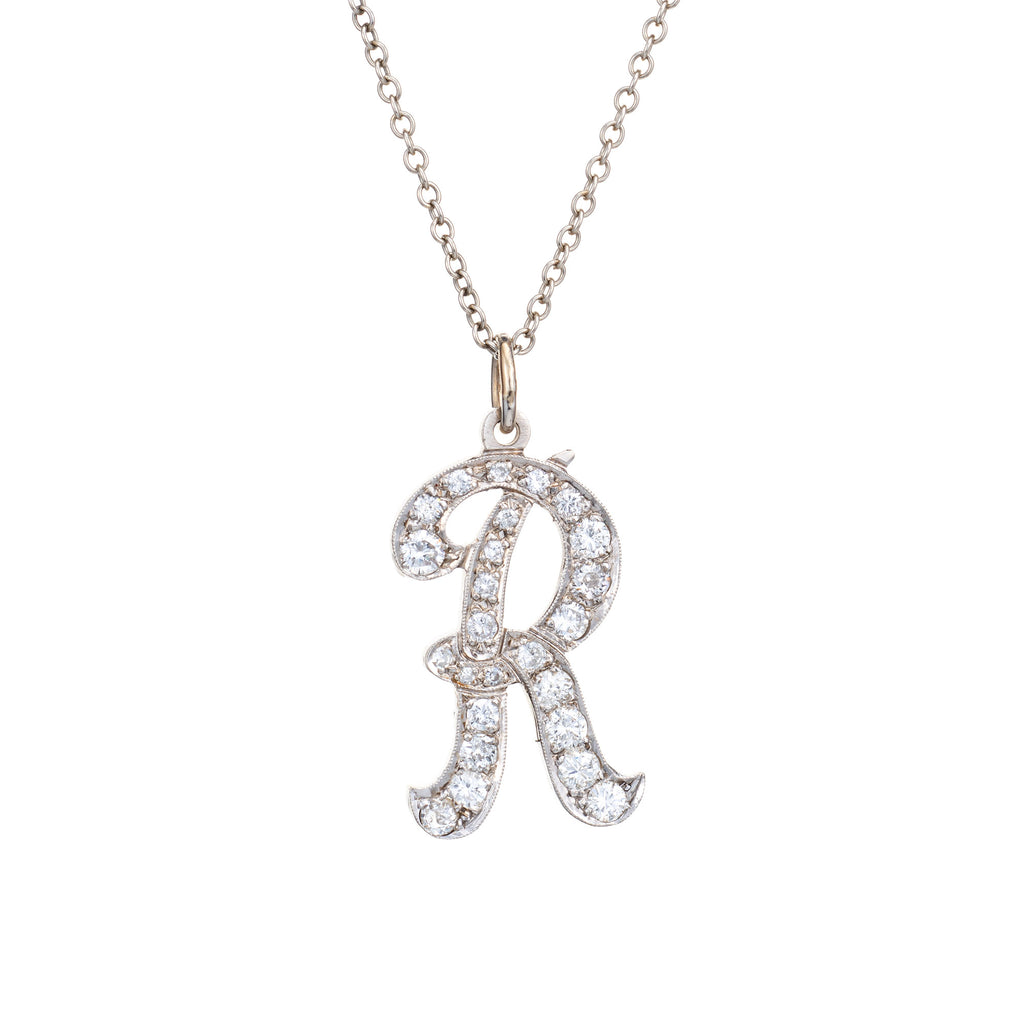 Stylish vintage letter "R" diamond necklace crafted in 14 karat white gold (circa 1960s).