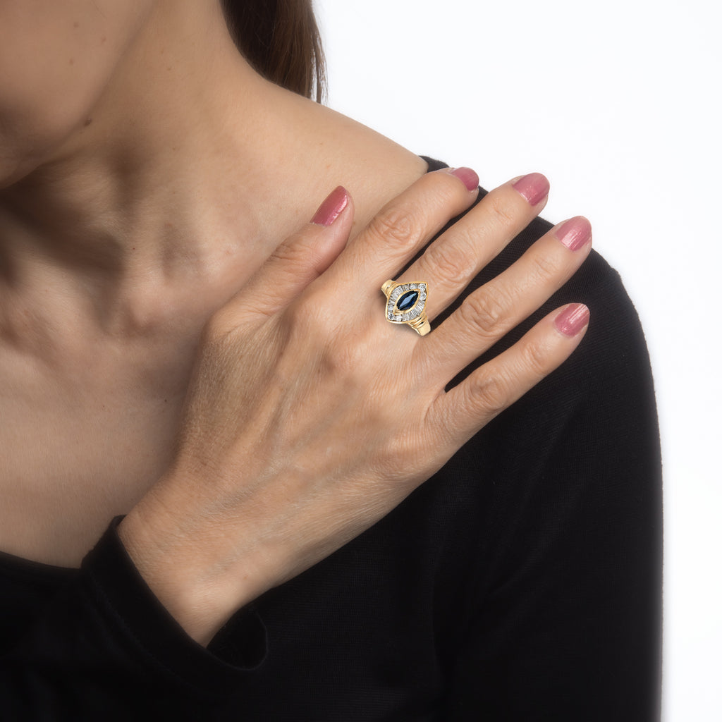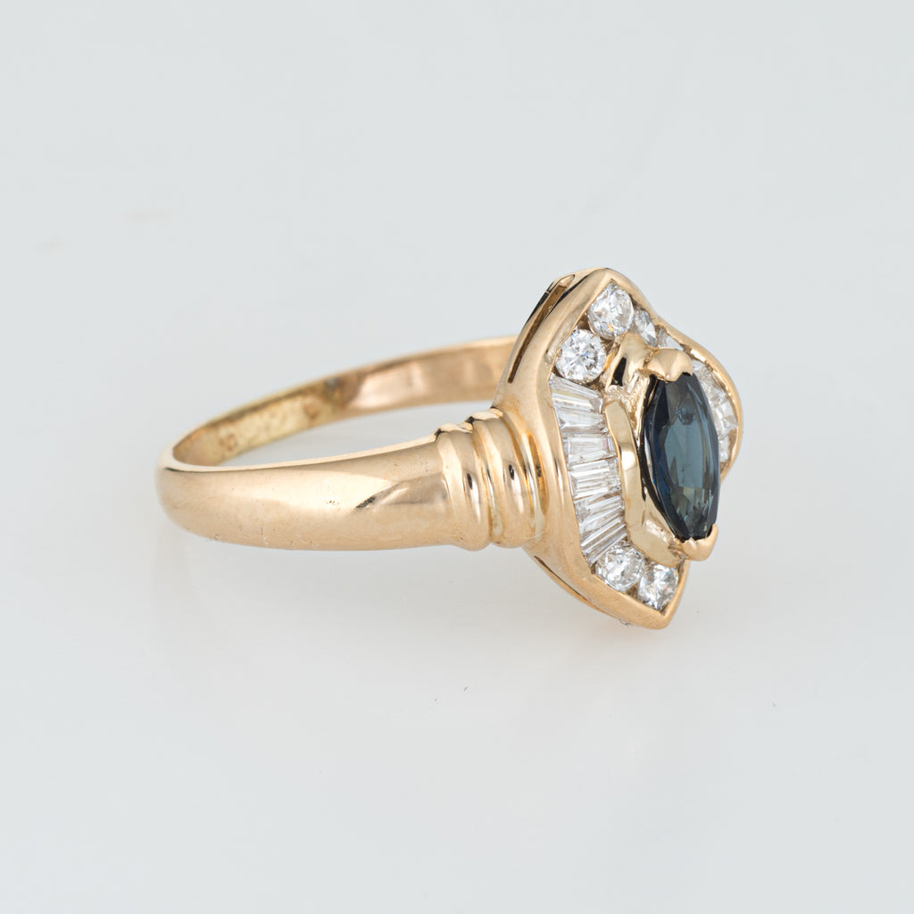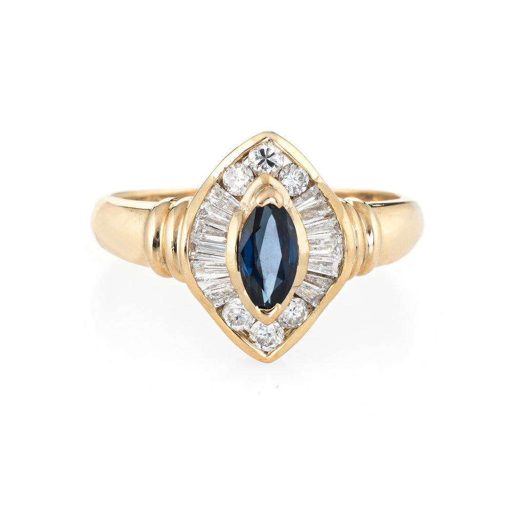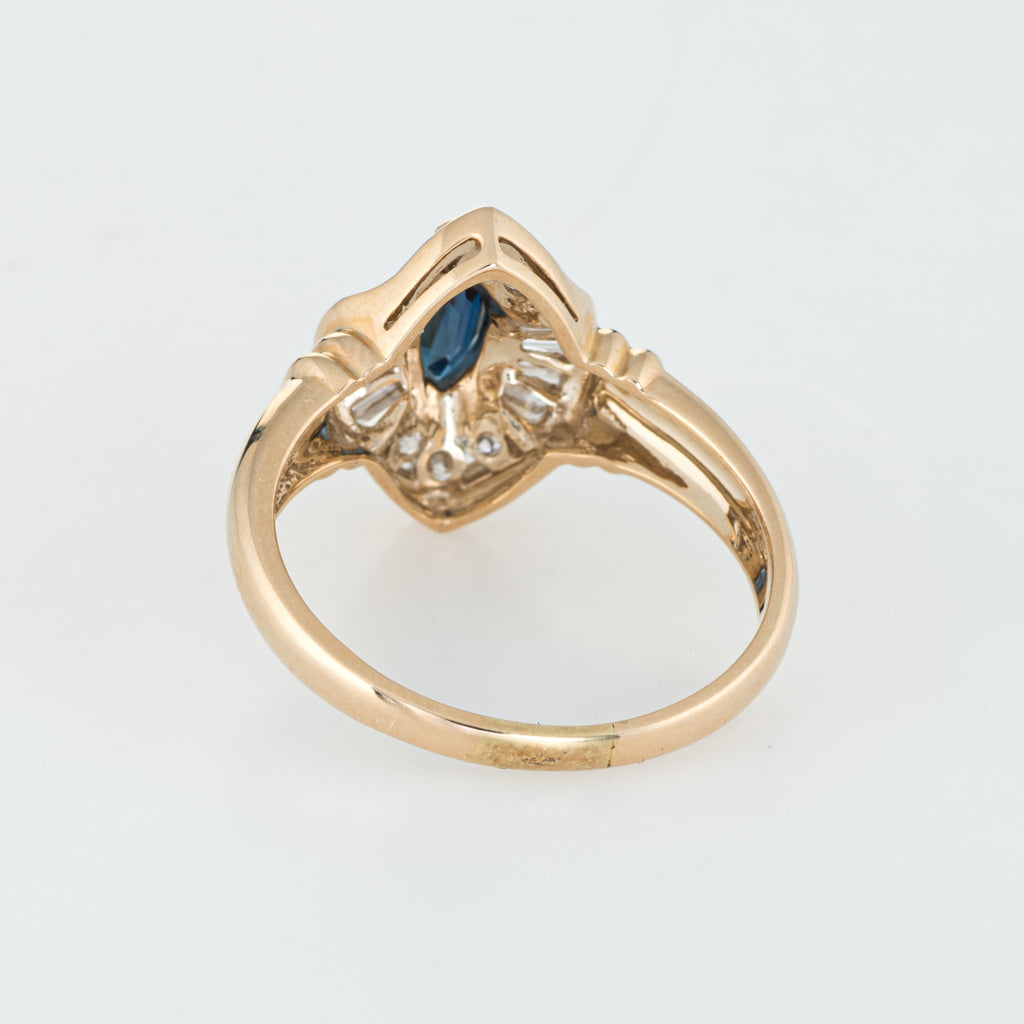Marquise cut sapphire is estimated at 0.50 carats, accented with an estimated 0.50 carats of mixed cut diamonds (baguette & round brilliant cut). The diamonds are estimated at H-I color and SI1-2 clarity). The sapphire is in excellent condition and free of cracks or chips.