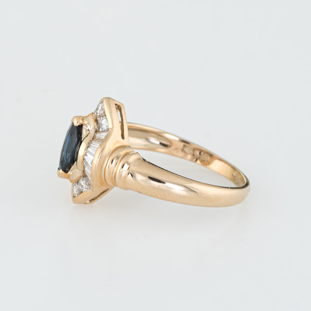 Stones: Marquise cut sapphire is estimated at 0.50 carats, accented with an estimated 0.50 carats of mixed cut diamonds (baguette & round brilliant cut). The diamonds are estimated at H-I color and SI1-2 clarity). The sapphire is in excellent condition and free of cracks or chips.