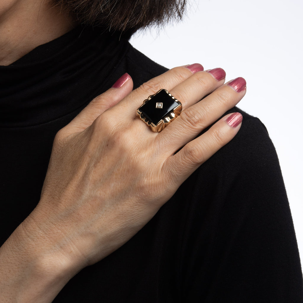 The bold ring is set with onyx and a diamond to the center. The statement ring is great for day or evening wear. The low to medium rise ring (6mm - 0.23 inches) sits comfortably on the finger.