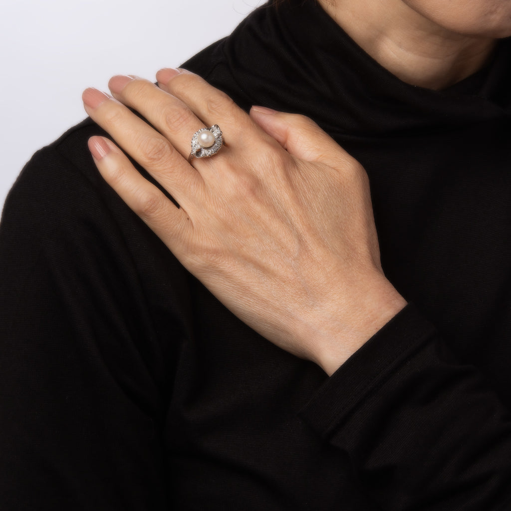 The Mid-Century ring makes a nice statement on the hand! Set with a lustrous cultured pearl to the center and sparkling diamonds to the slightly raised circular mount. The medium rise ring (11mm - 0.43 inches) sits comfortably on the finger.