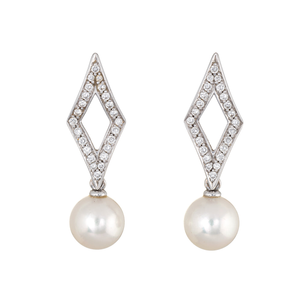 Mikimoto Diamond Cultured Akoya Pearl Earrings 18k White Gold Estate Triangle