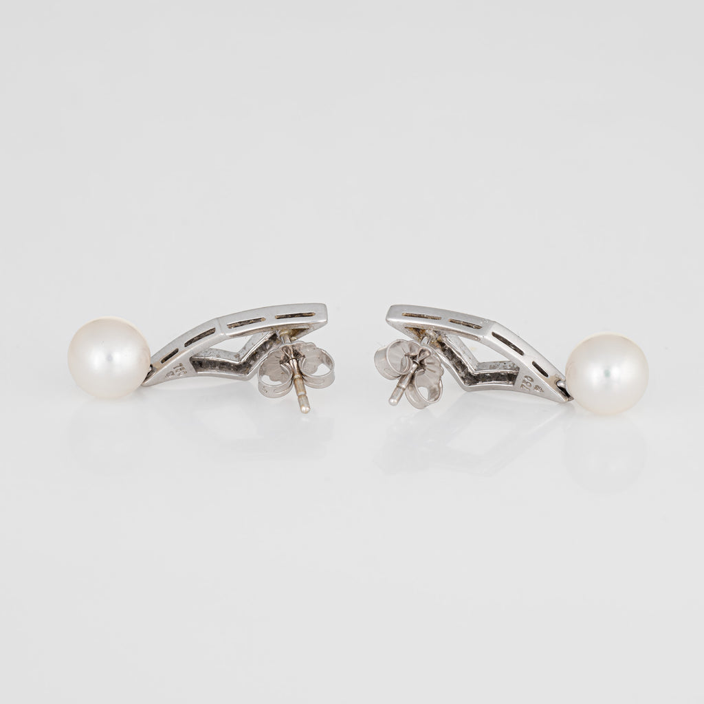 Elegant pair of Mikimoto cultured Akoya pearl & diamond earrings crafted in 18k white gold.
