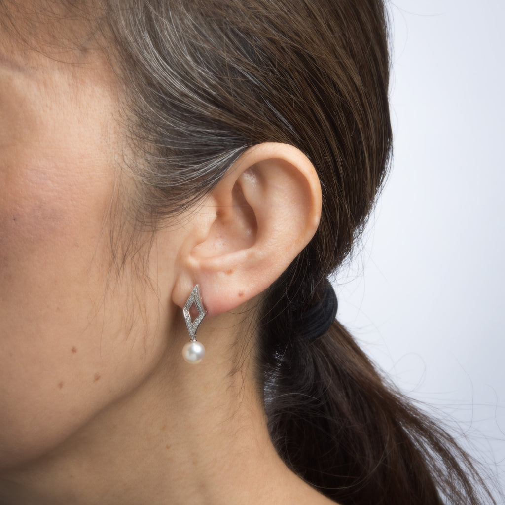 The triangular design terminates to the pearl drops. The elegant earrings sit nicely on the earlobe and are great for day or evening wear. The earrings are fitted with posts & butterfly backings for pierced ears.